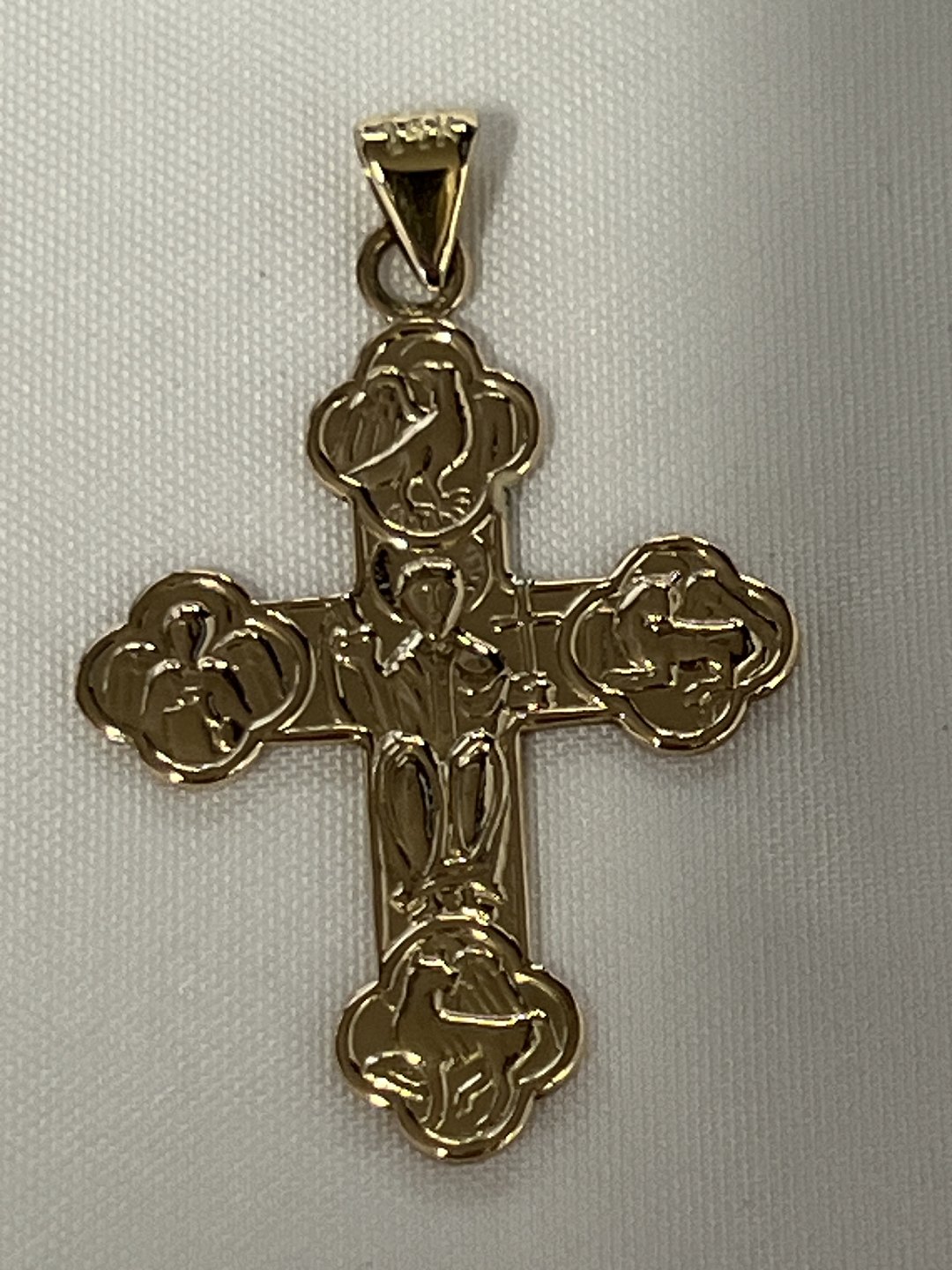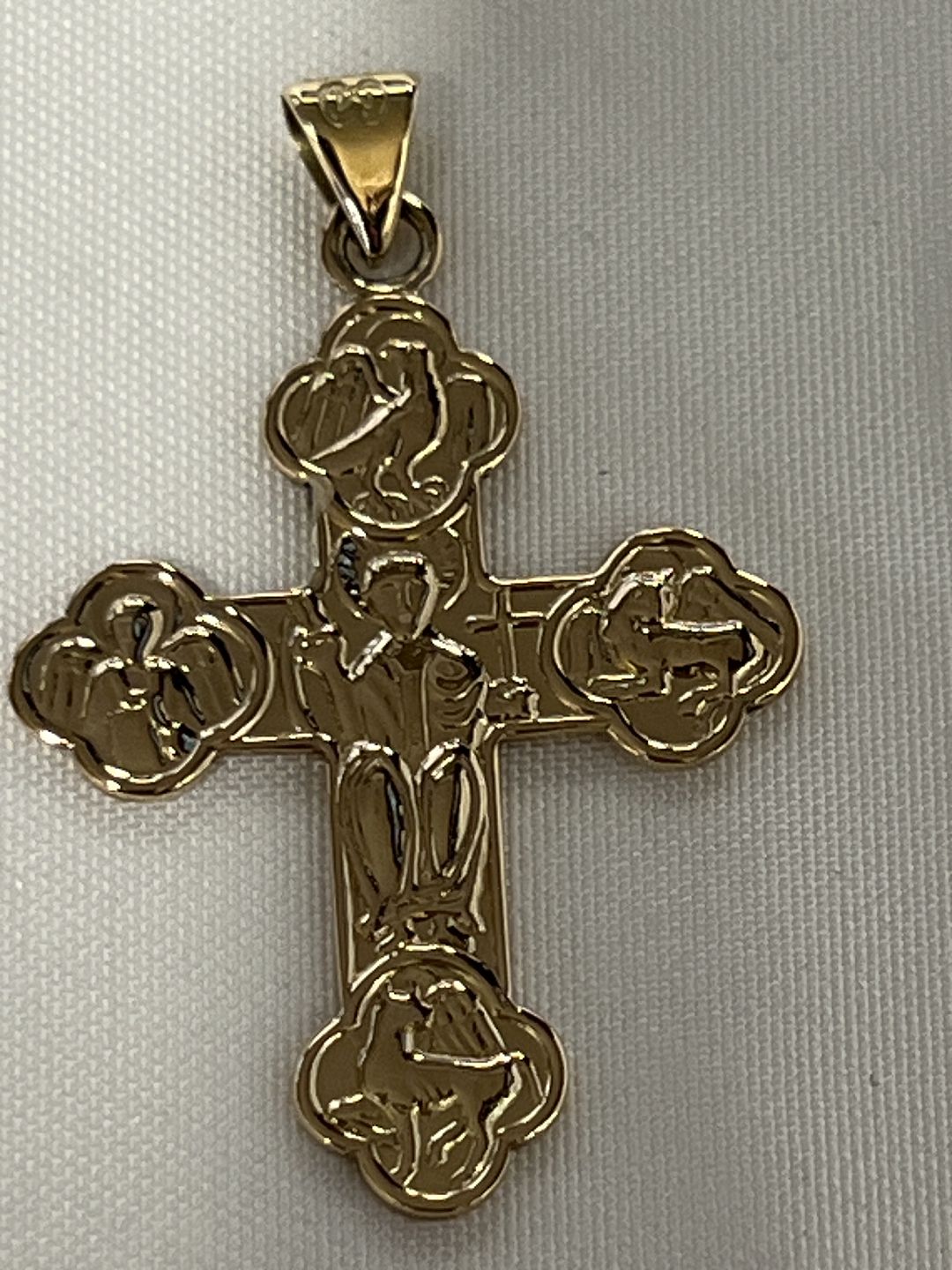 This Daymark cross is something very special because the cross arms have animal symbols with the 4 evangelists - Matthew as a winged man, Mark as a winged lion, Luke as a winged ox and John at the top as an eagle. Jesus himself is in the middle of the cross.This variant of the Daymark cross is rare, but stunning due to the pictures of the 4 evangelists, instead of just patterns in the cross arms.