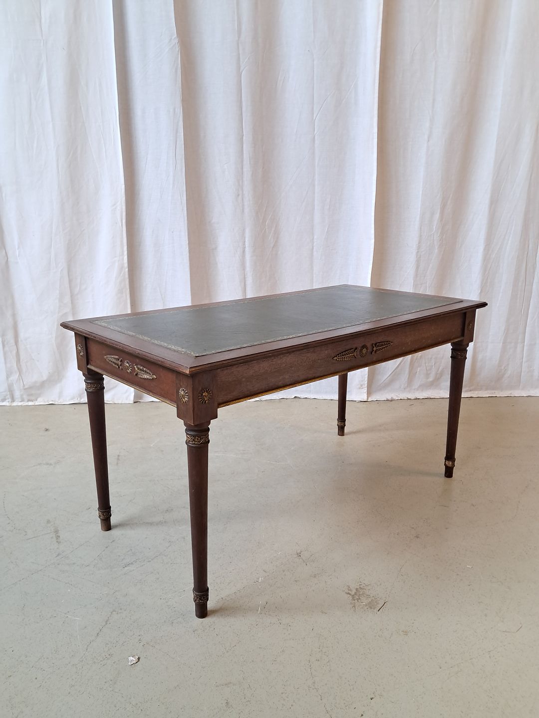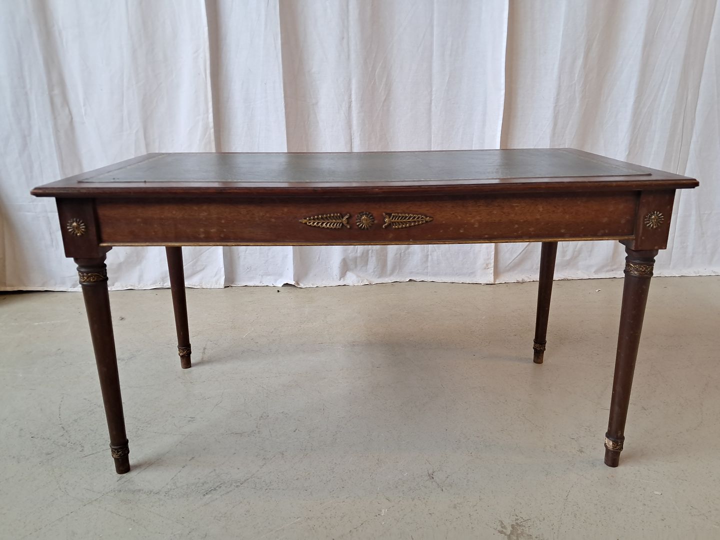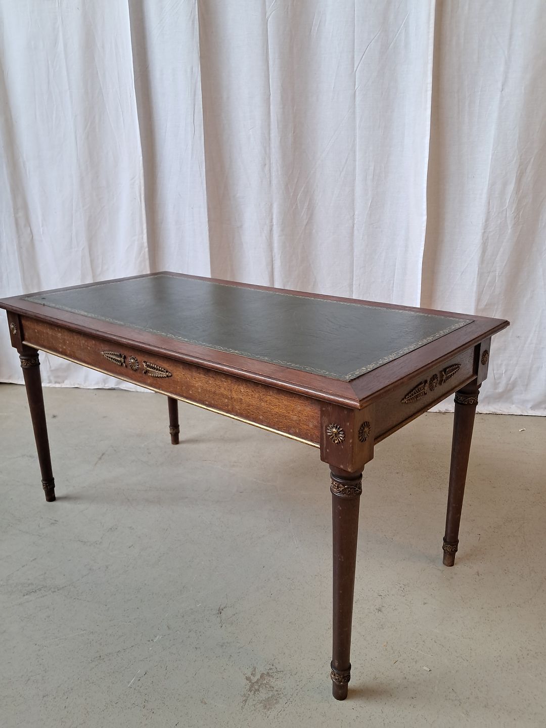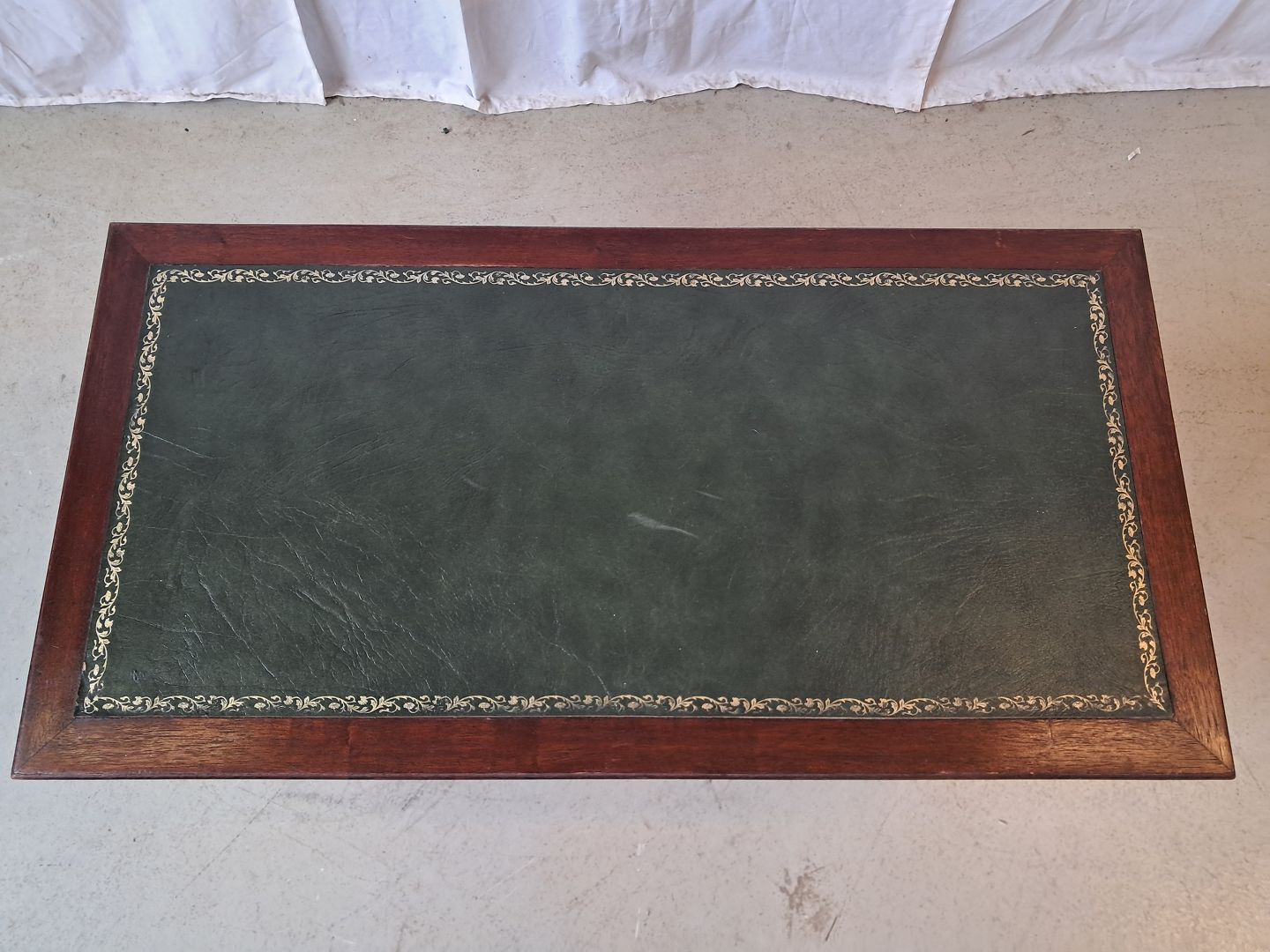Sofabord i fineret mahogni med kunstlæder indlæg, fra 1980erne.
