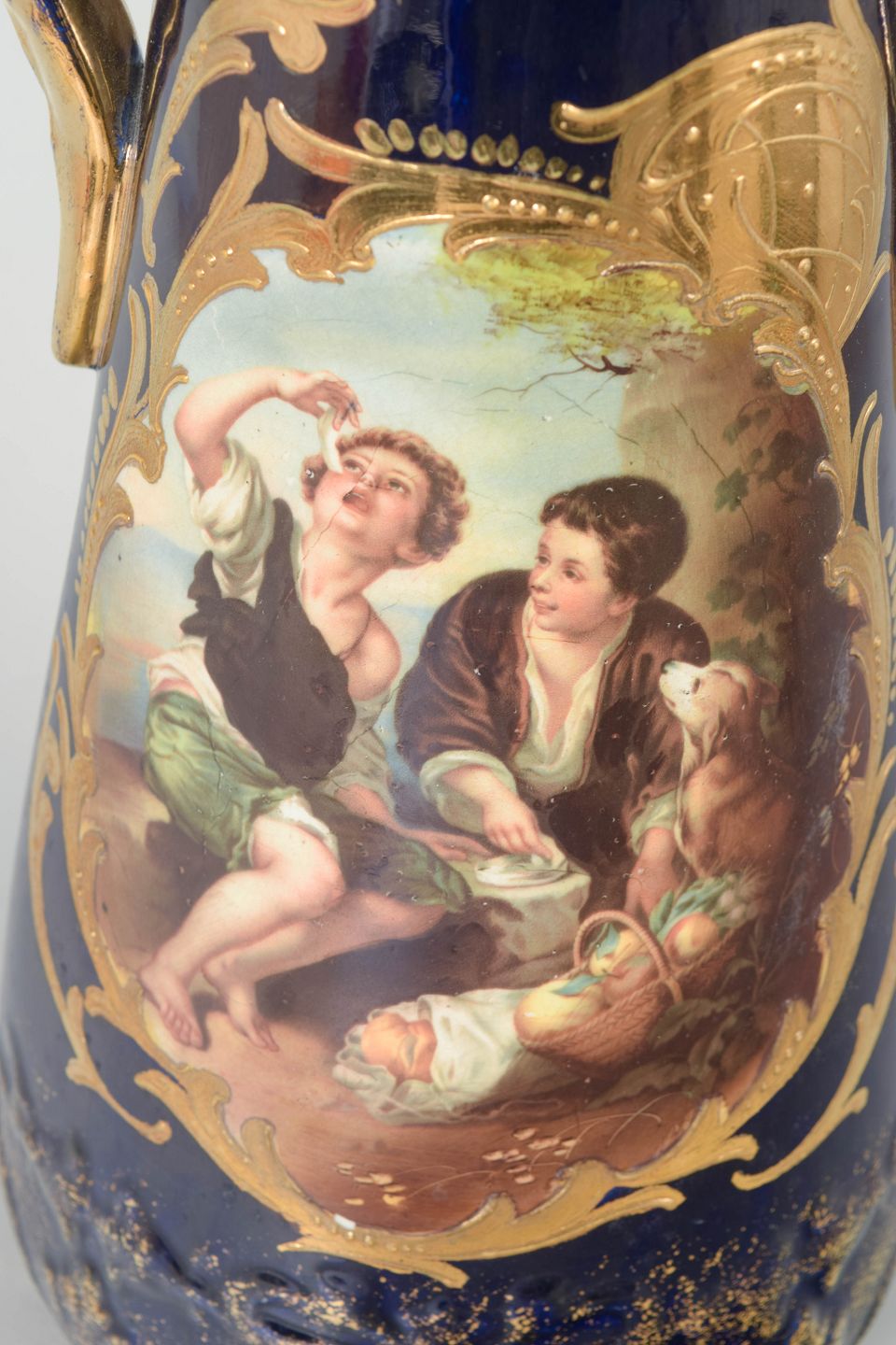 Faience vase with romantic scene.Tall baluster-shaped faience vase with deep cobalt blue glaze, richly decorated with gilded details and a central scene depicting figures in a classical style.