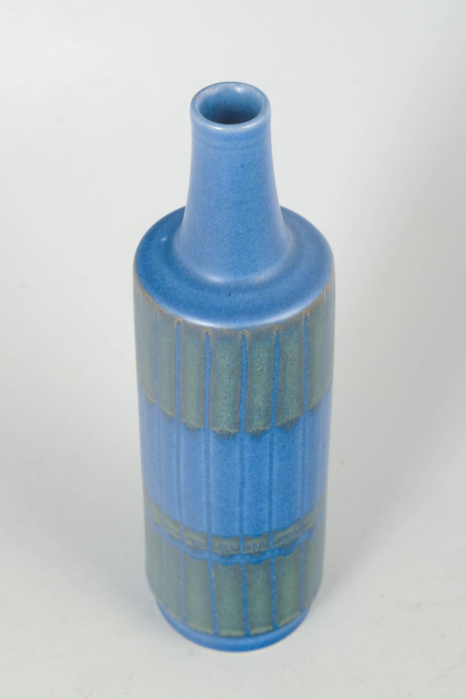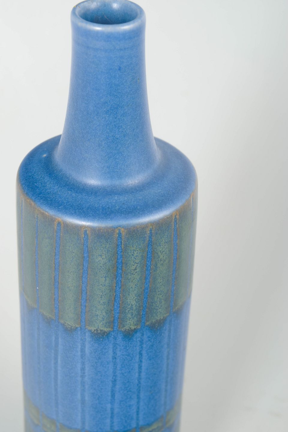 Slim cylindrical stoneware vase with vertical fluting and a blue glaze with green tones and decorative bands.