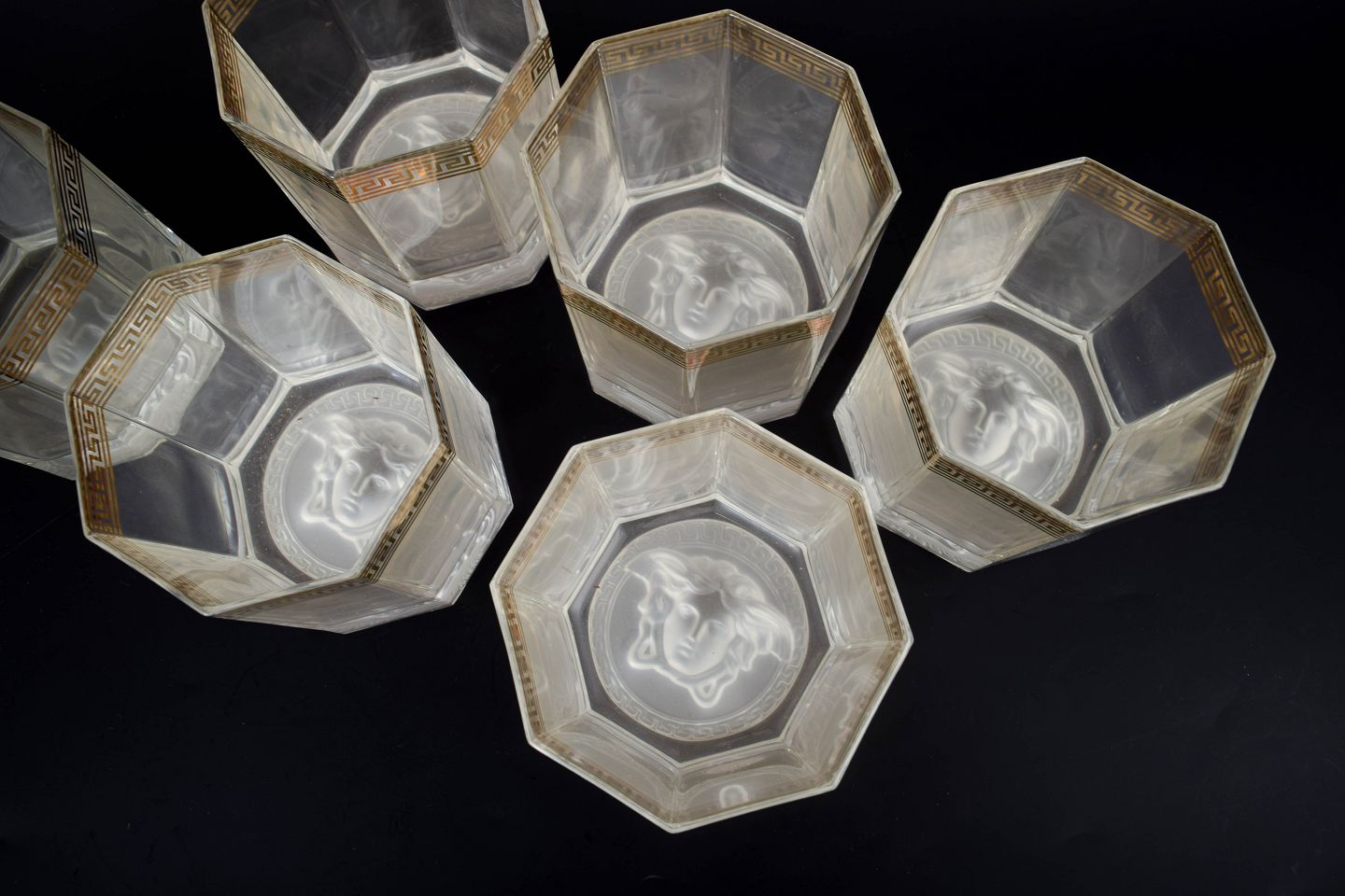 Versace for Rosenthal, set of six whisky glasses "Medusa".Set of six whisky glasses in clear glass featuring the distinctive Medusa motif from the Versace line produced by Rosenthal.