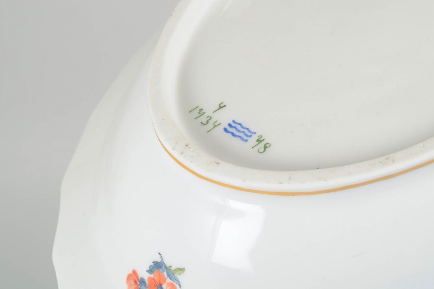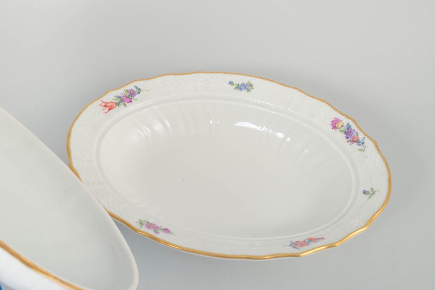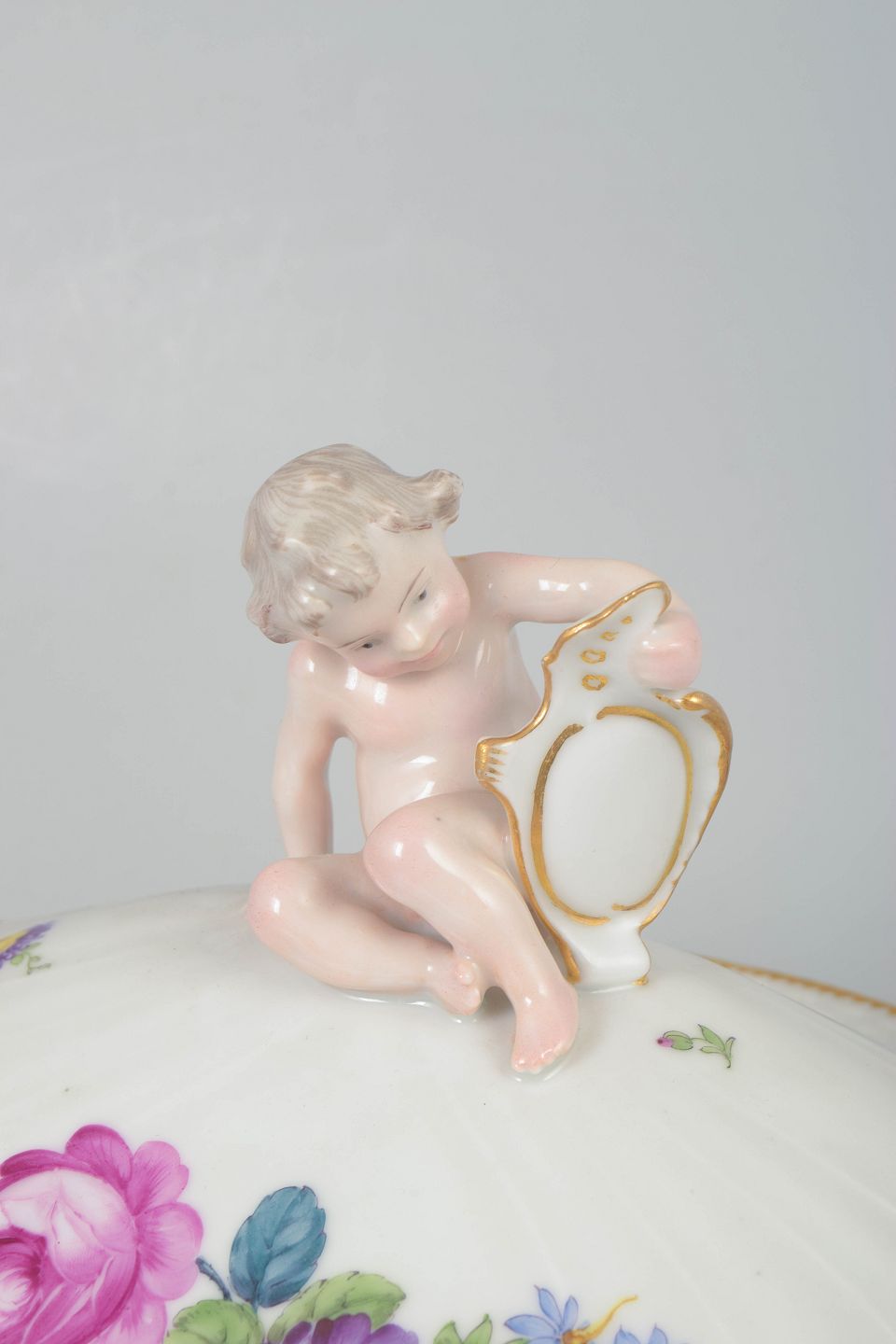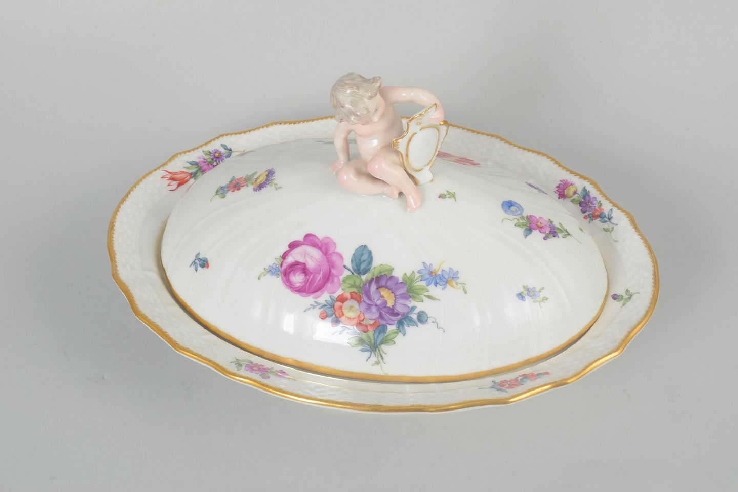 Royal Copenhagen Saxon flower, large lidded bowl.Large oval porcelain lidded bowl with polychrome floral decoration in the Saxon flower pattern and gilded rim. The lid is finished with a knop in the form of a cherub figure. Model 4/1734.