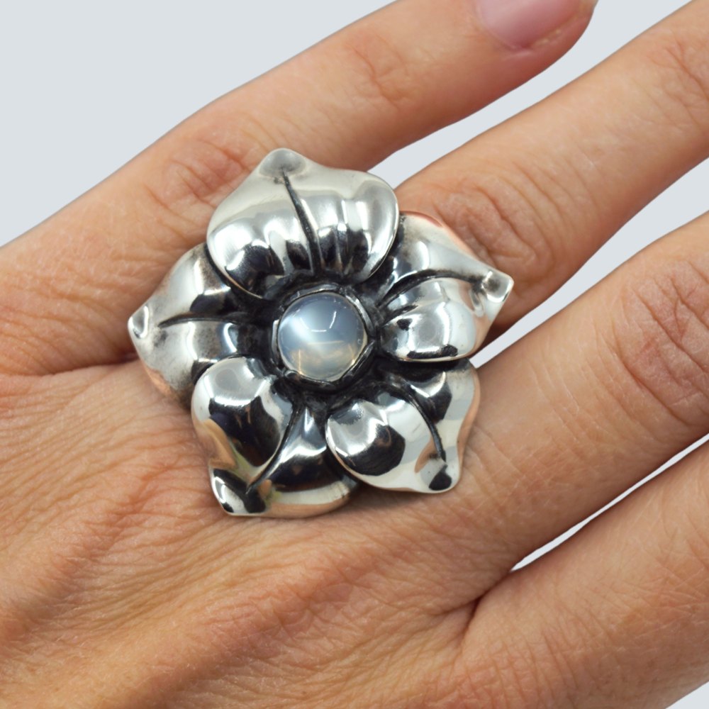 Regitze Overgaard for Georg Jensen; Flower ring in silver, set with a moonstone, no. 562a. Ring size 53.Stamped "Georg Jensen 925 S 562a 53".