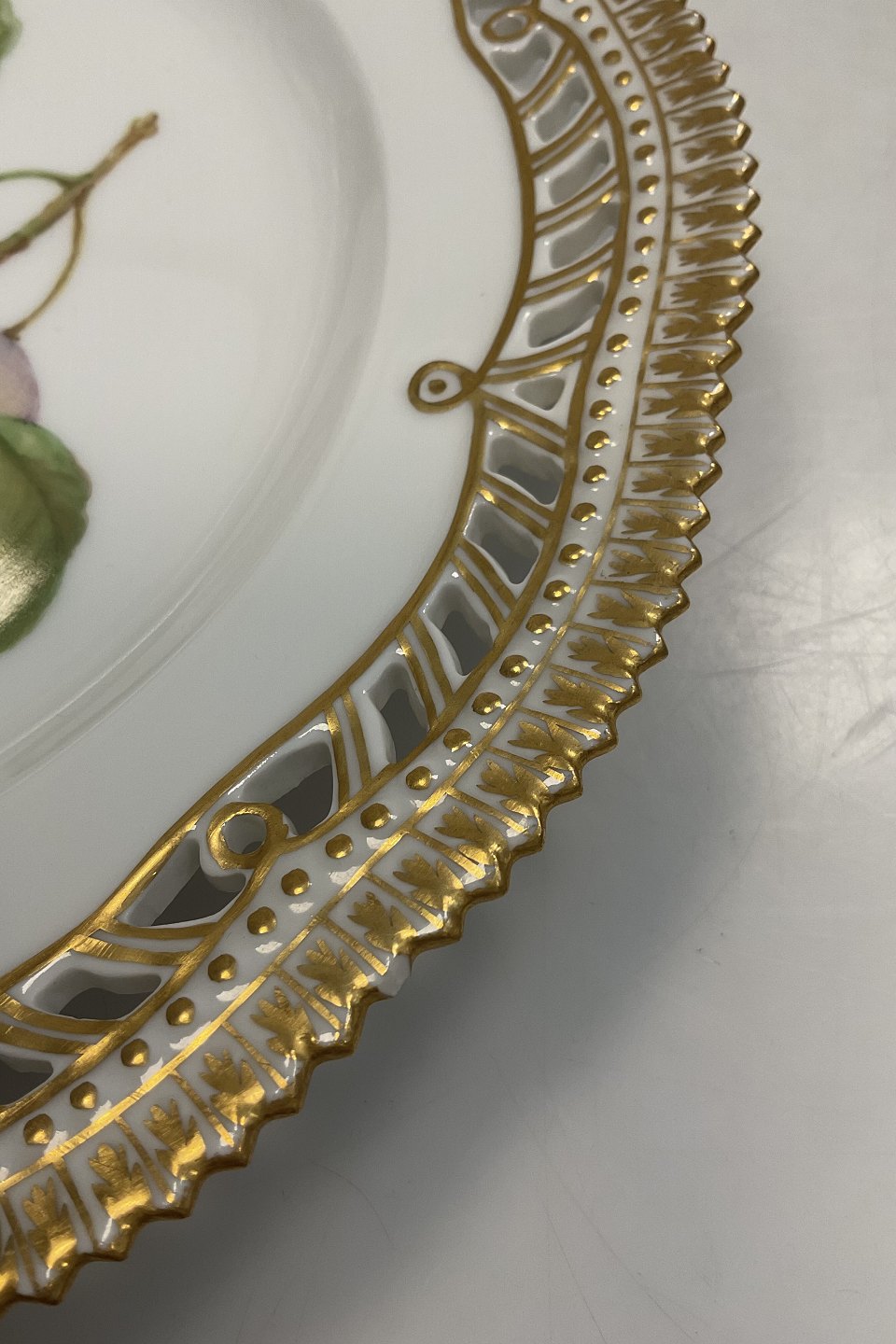 Royal Copenhagen Flora Danica Fruit Plate No. 429/3554. Measures 22.7 cm / 8.93 inch. 1st Quality. Pierced Border.Har af chips on 1 tooth