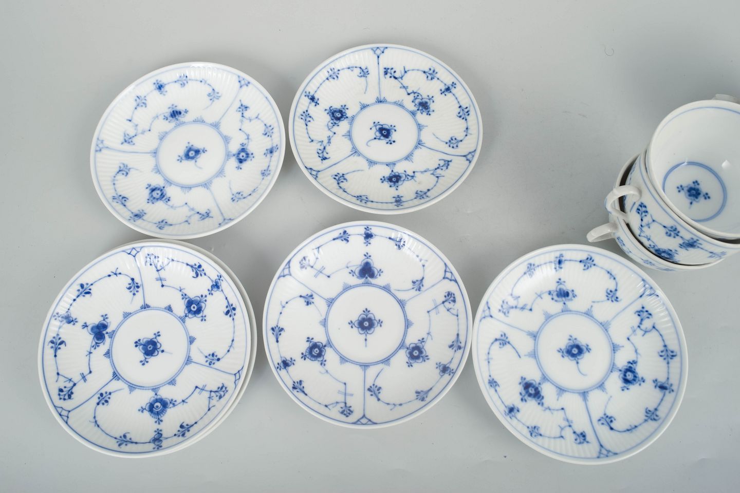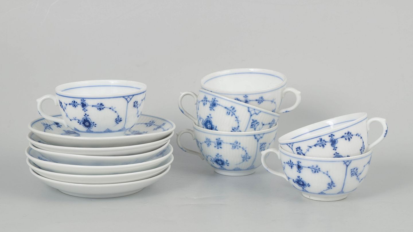 Royal Copenhagen Blue Fluted Plain, set of six coffee cups with matching saucers.Classic set of six coffee cups with matching saucers from Royal Copenhagen’s Blue Fluted Plain service, model 1/465, crafted in hand-painted porcelain with the iconic cobalt blue pattern. The set includes both first factory quality examples and pieces with one incised cancellation line, dating from the early 20th century to the 1980s.