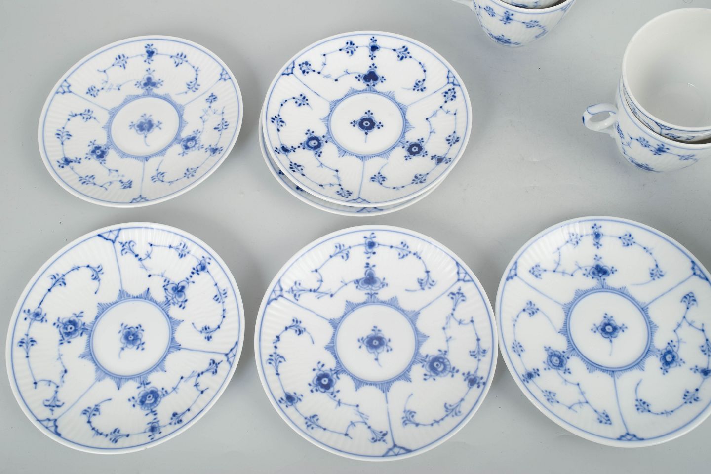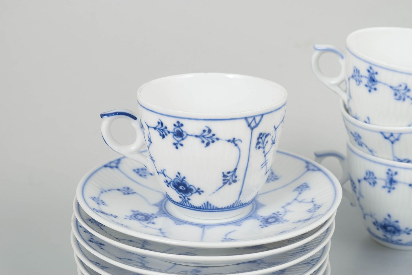 Royal Copenhagen Blue Fluted Plain, set of six coffee cups with matching saucers.Classic set of six coffee cups with matching saucers from Royal Copenhagen’s Blue Fluted Plain service, model 1/80, crafted in hand-painted porcelain with the iconic cobalt blue pattern. All pieces are first factory quality and were produced between the 1920s and the 1980s.