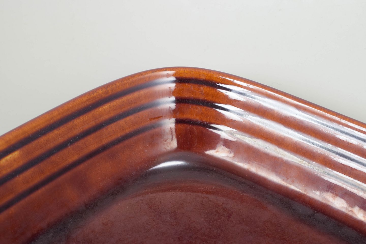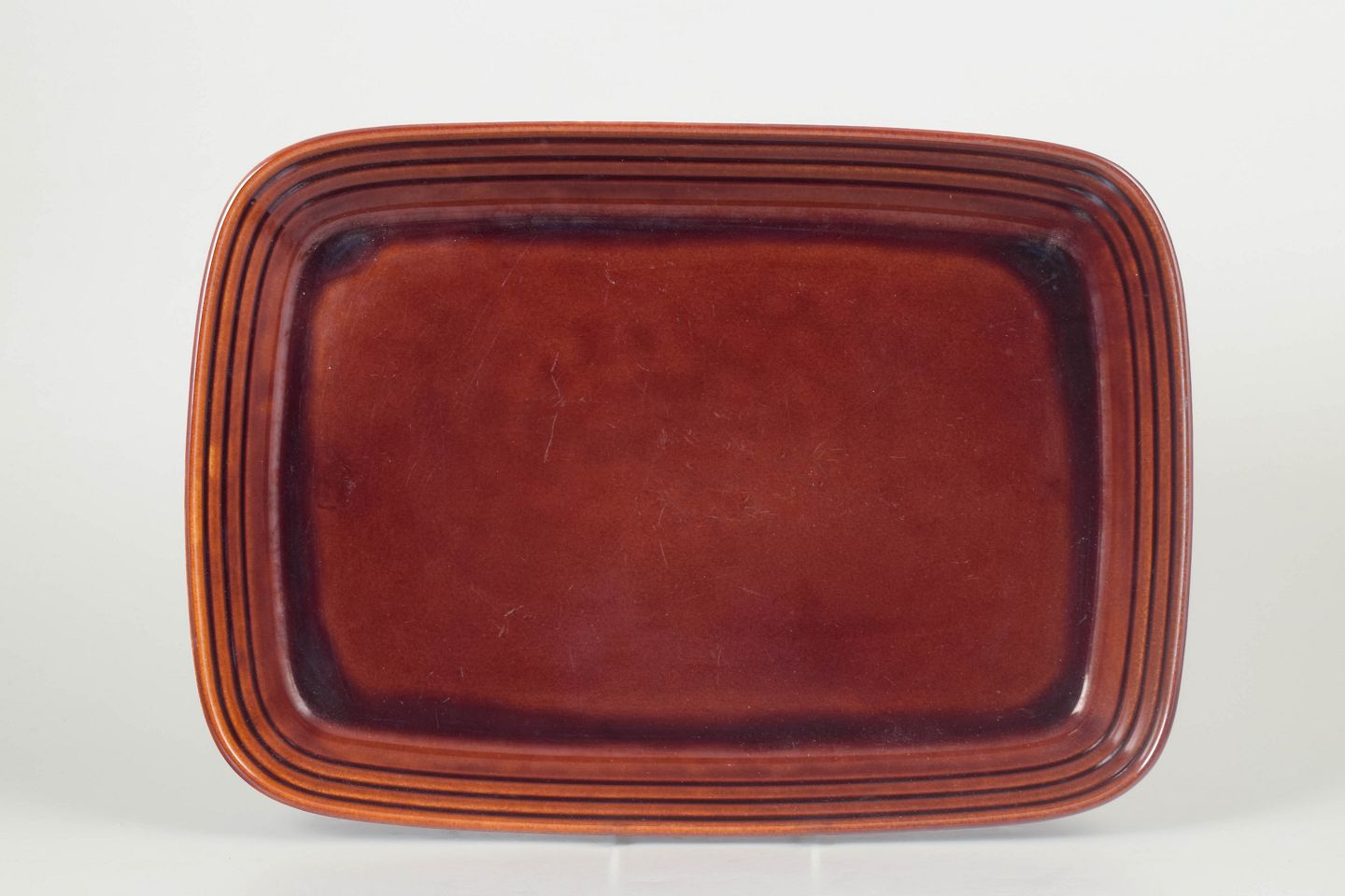 Large rectangular stoneware serving tray from the "Rustik" series with warm brown glaze and characteristic ribbed border. Designed in the 1970s with functional and timeless Swedish design language.
