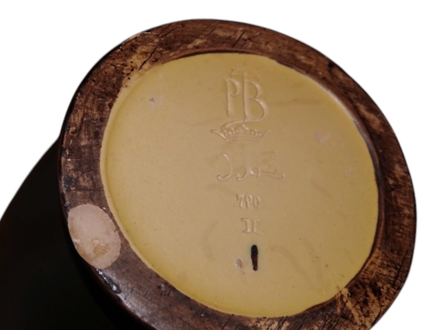 There are two chips on the bottom edge, a small chip at the top and a repair on a bunch of grapes, see photos.