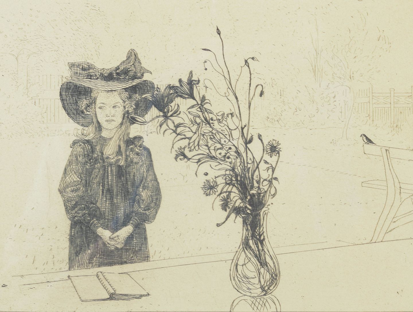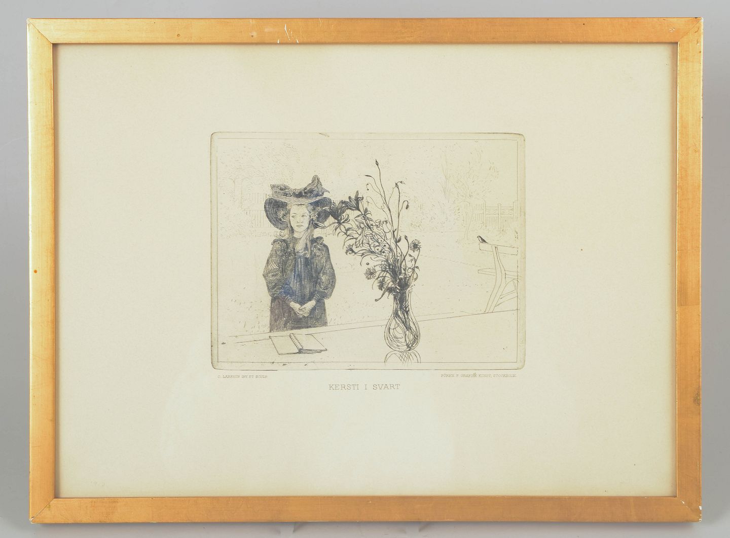 “Kersti i svart” featuring a poetic figurative composition, executed as a detailed etching depicting a young girl alongside floral still life elements in an interior setting. "Selskabet for Grafisk Kunst 1910." Society of graphics art, 1910.