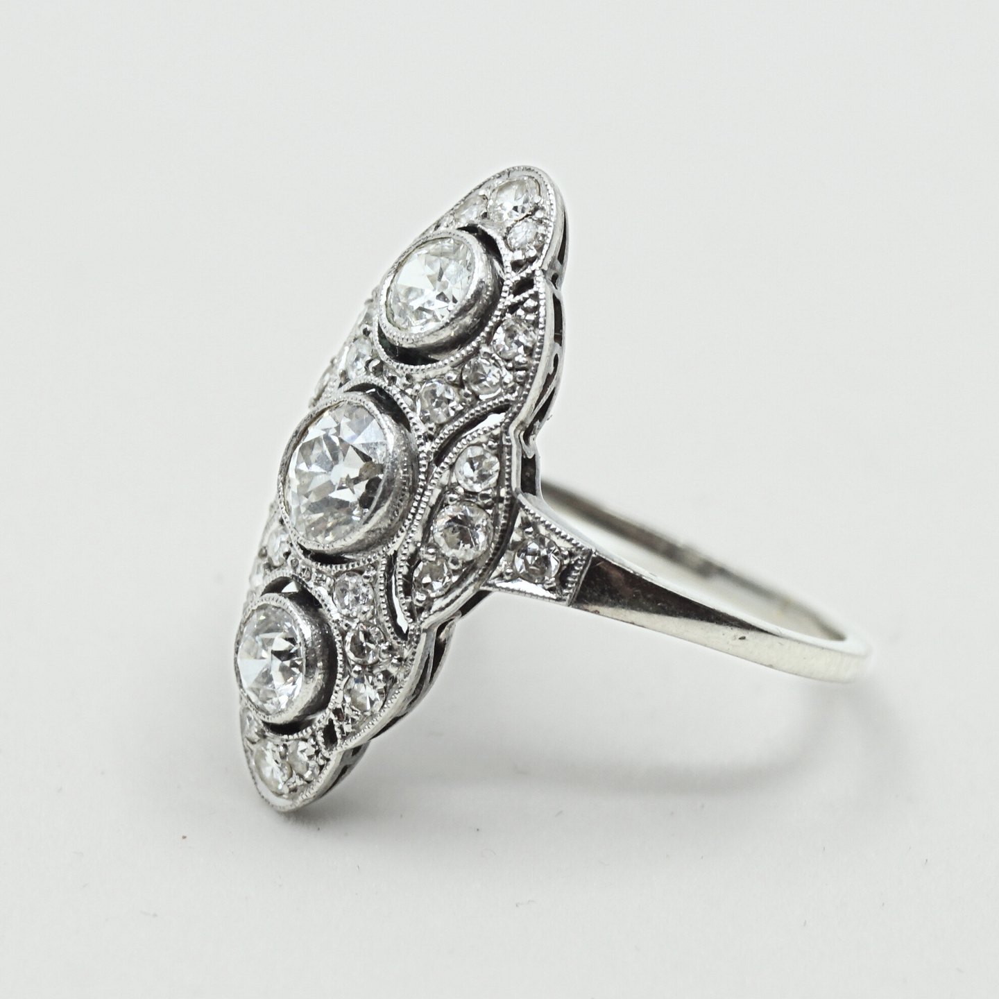 Ring of 14k white gold in art deco style. From the 1930s. Set with 3 larger diamonds, with a total of 1.47 ct. Surrounded by numerous