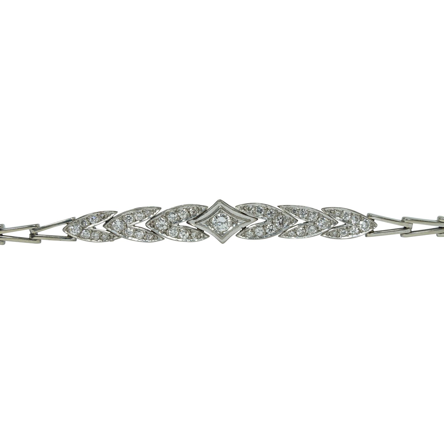 Diamantarmbånd af 18 kt. hvidguld prydet med talrige brillantslebne diamanter på i alt ca. 1.20 ct. Farve: Wesselton (H). Klarhed: VVS. Slibning: Very Good. Monteret med kasselås