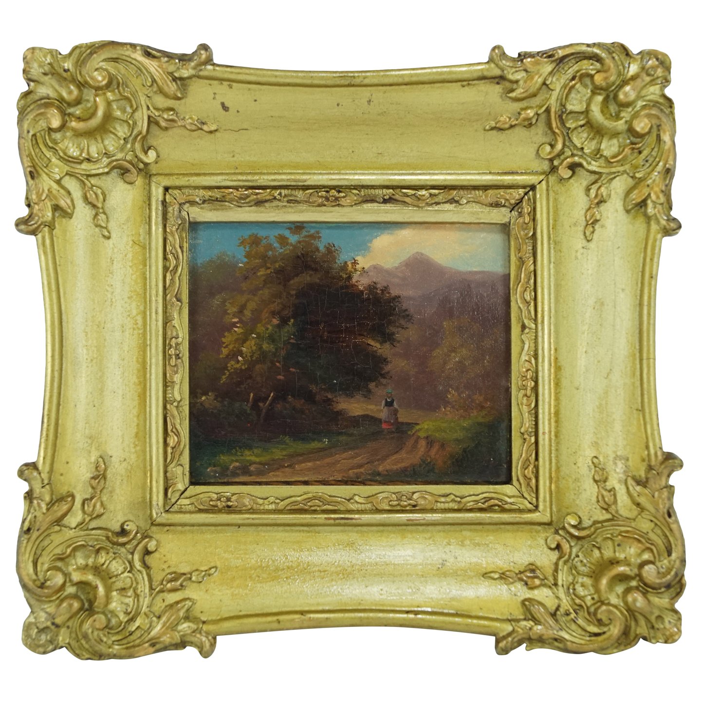 Par oliemalerier, malet på træ. Usigneret, omkring 1870. Lysmål: H. 8,2 cm. B. 10,2 cm. Med ramme: H. 19 cm. B. 20,5 cm.