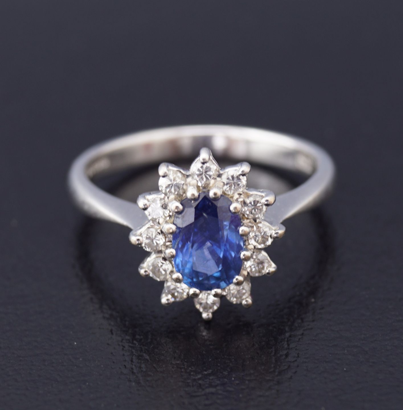 A 18 kt. white gold ring with a sapphire and wreathed with diamonds in total 0,36 ct. Colour: Wesselton. Clarity: VS. Ring size 54.