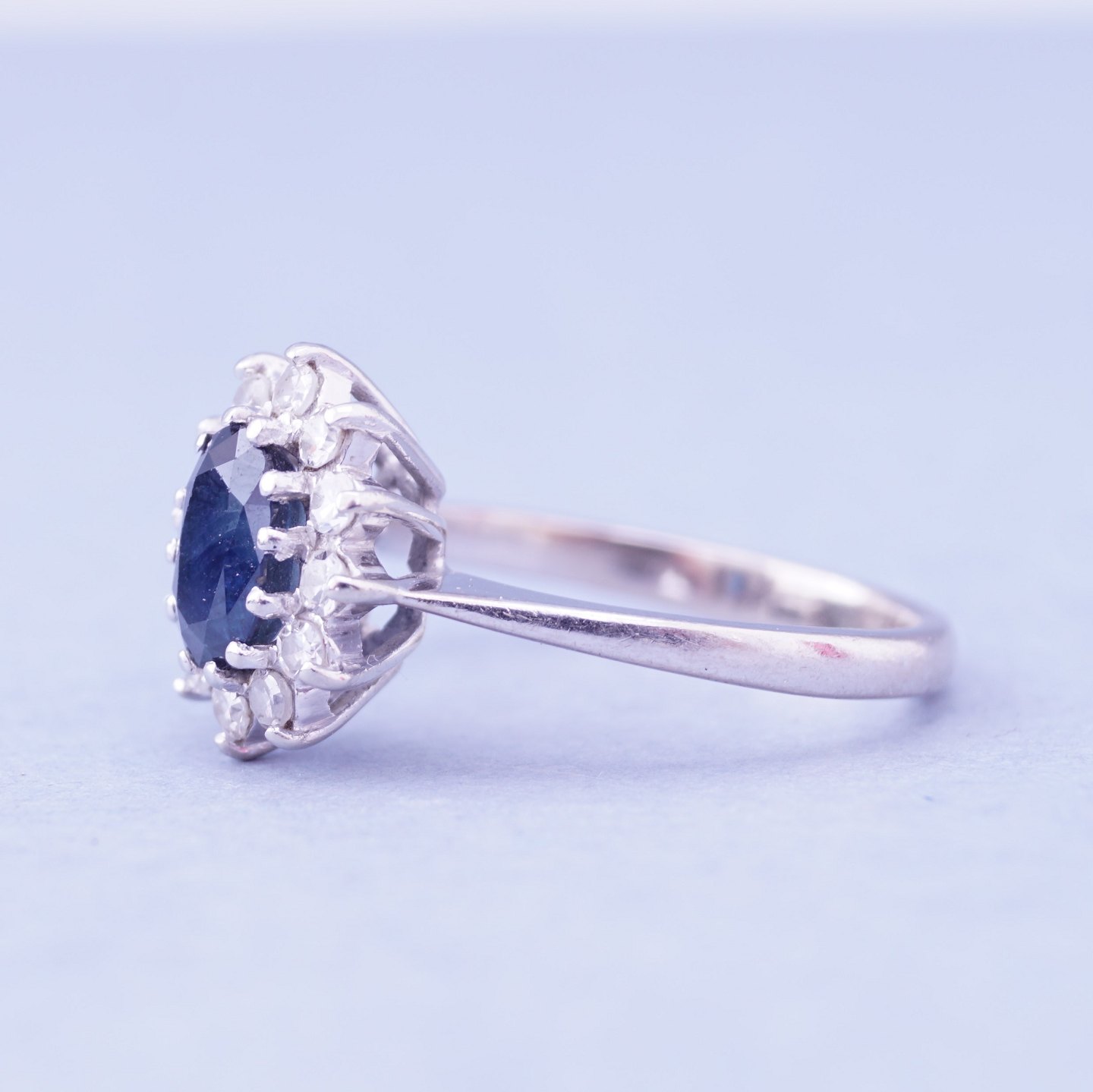 A 14 kt. white gold ring with a sapphire and wreathed with diamonds. Ring size 51½.