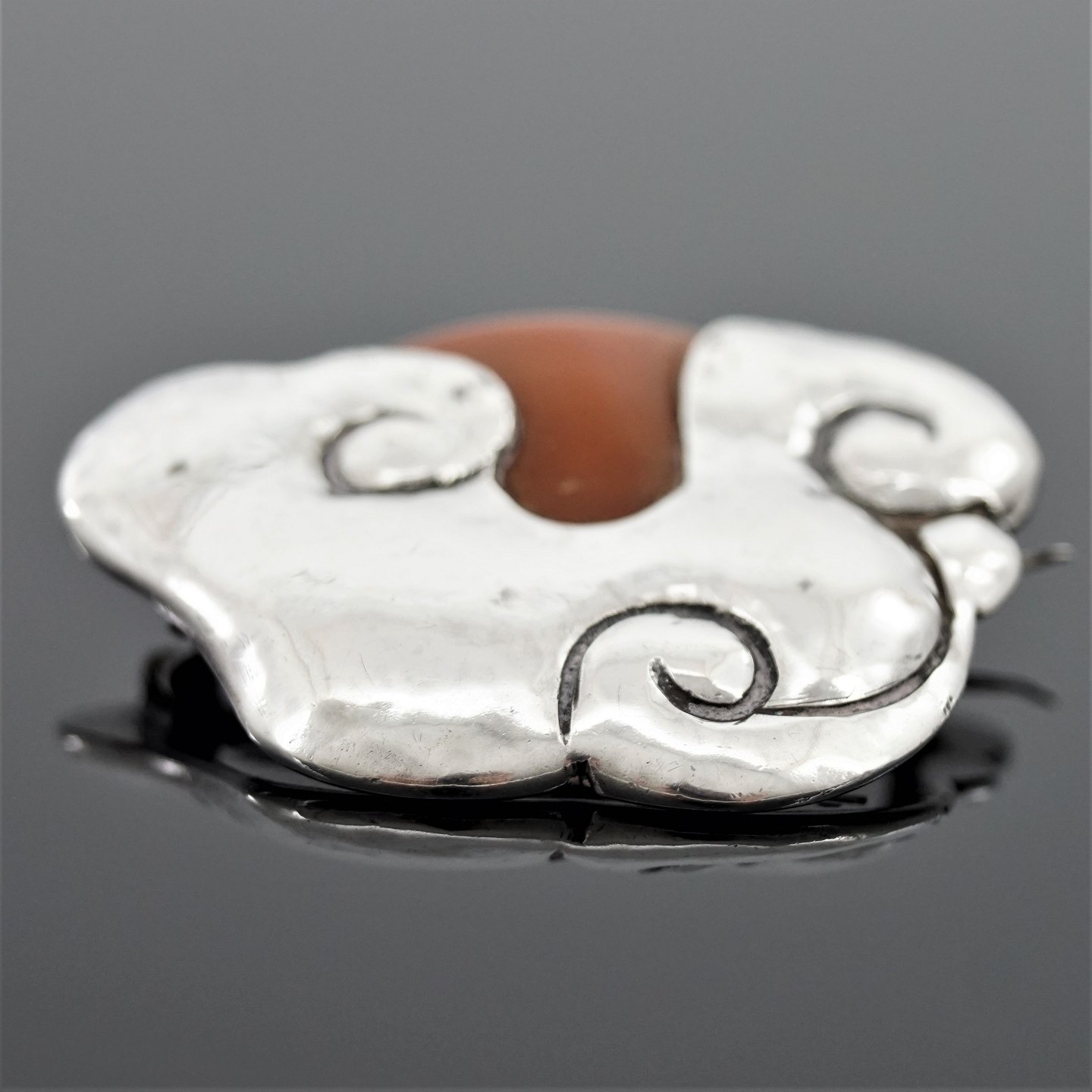 Thorvald Bindesbøll for Holger Kyster; Skønvirke broche af sølv, prydet med rav. H. 3,2 cm. B. 4 cm.