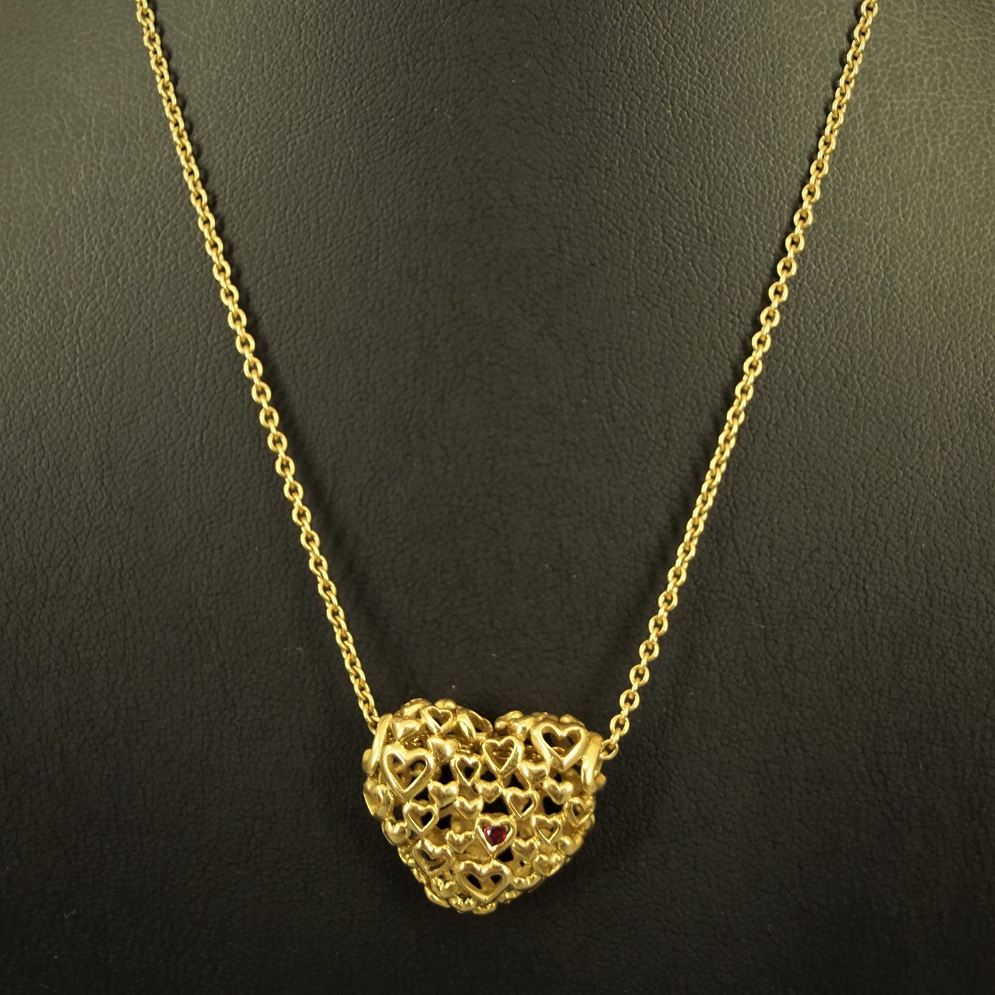 Georg Jensen; Halskæde af 18 kt. guld med stort guldhjerte, prydet med mange små hjerte, én med rubin. Halskæde længde 75 cm. Vedhæng h. 2,2 cm. b. 2,4 cm.