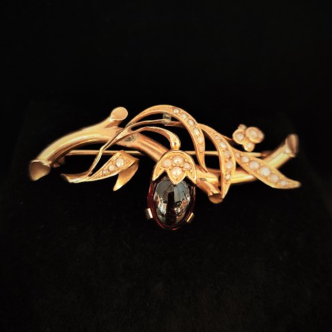 A gold brooch set with a granate and pearls.