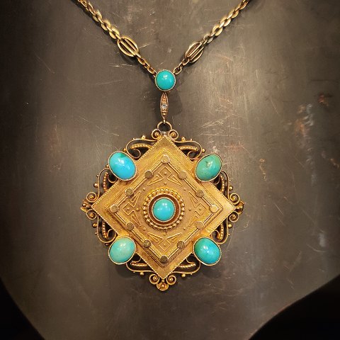P. Hertz; 1800-tals halskæde med smykke af 14 kt. guld med turkiser og en diamant