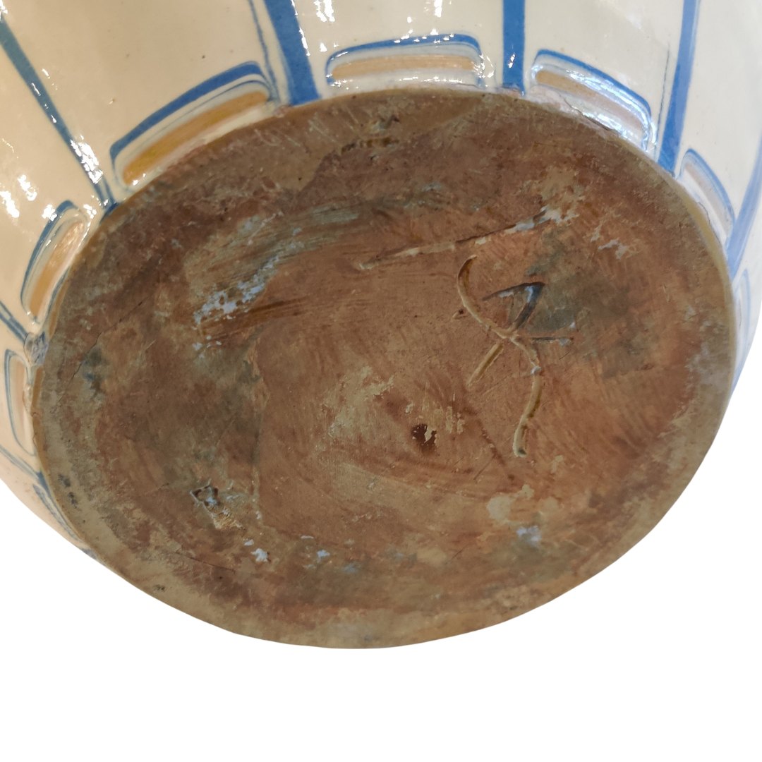 Herman A. Kähler; Stor vase i lertøj med mønster i råhvid og blå glasur. fra omkring 1940-1950. H. 35,5 cm. Diam. ca. 30 cm. Diam. top 13 cm.