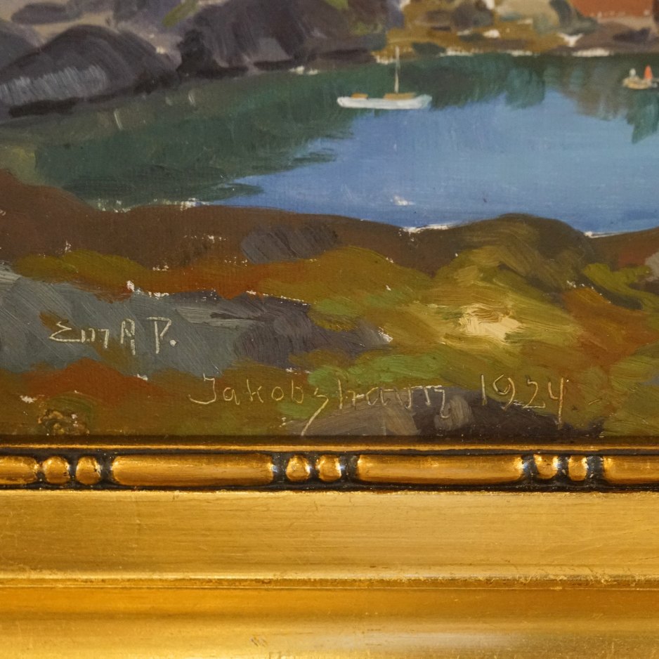Emanuel A. Petersen grønlandsk oliemaleri med motiv af Jakobshavn / Ilulissat, år 1924