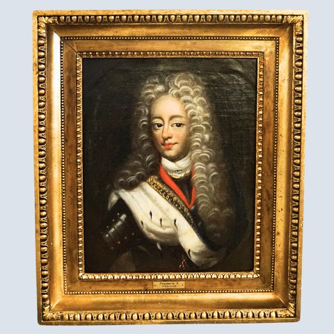 Samtidig maleri af Kong Frederik den 5. (1723-1766), med Allongeparyk og rustning hvor han bærer et klæde af hermelin henover. I guldramme. Maleriet er malet på lærred og senere opsat på plade.