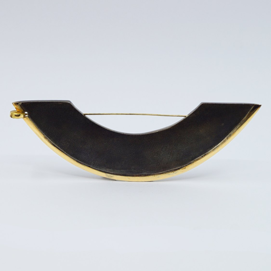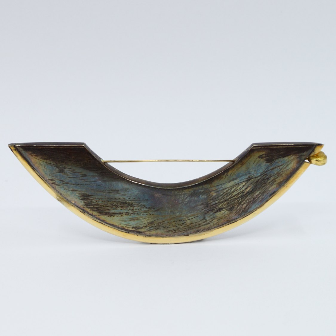 Anette Kræn; Stor kraftig sølv broche med oxideret overflade og pyntet med 14 kt. guld. Kan vendes på to forskellige måder, med hver sit udtryk.