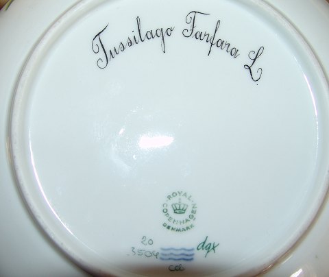 Royal Copenhagen Flora Danica Serving Bowl No 3504. Latin name "Tussilago Farfara L. In good condition. Is marked as a second, but is factory issue. Measures 23cm.