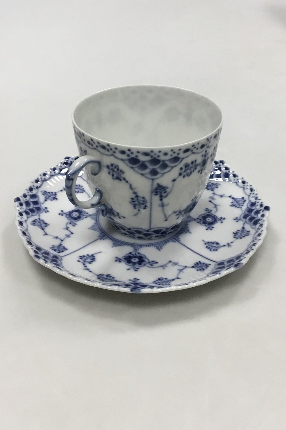 Royal Copenhagen Blue Fluted Full Lace Coffee Cup and Saucer No. 1035. Cup measures 6.5 cm (2 9/16") and saucer 13.7 cm (5 25/64").