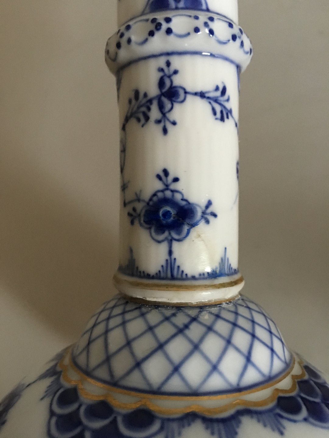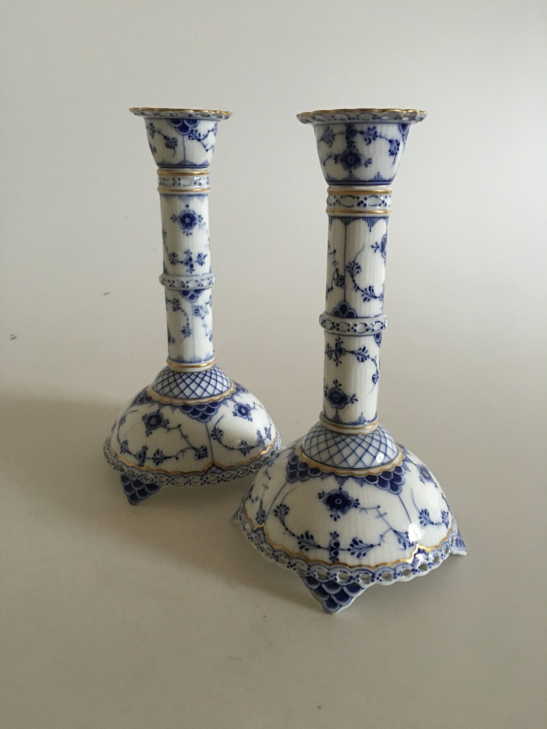 Royal Copenhagen Blue Fluted Full Lace with Gold Candlesticks No 1008. 20 cm tall (7 7/8"). One of the candlesticks has a reparation close to the candle foot (look at picture). Otherwise in good condition.