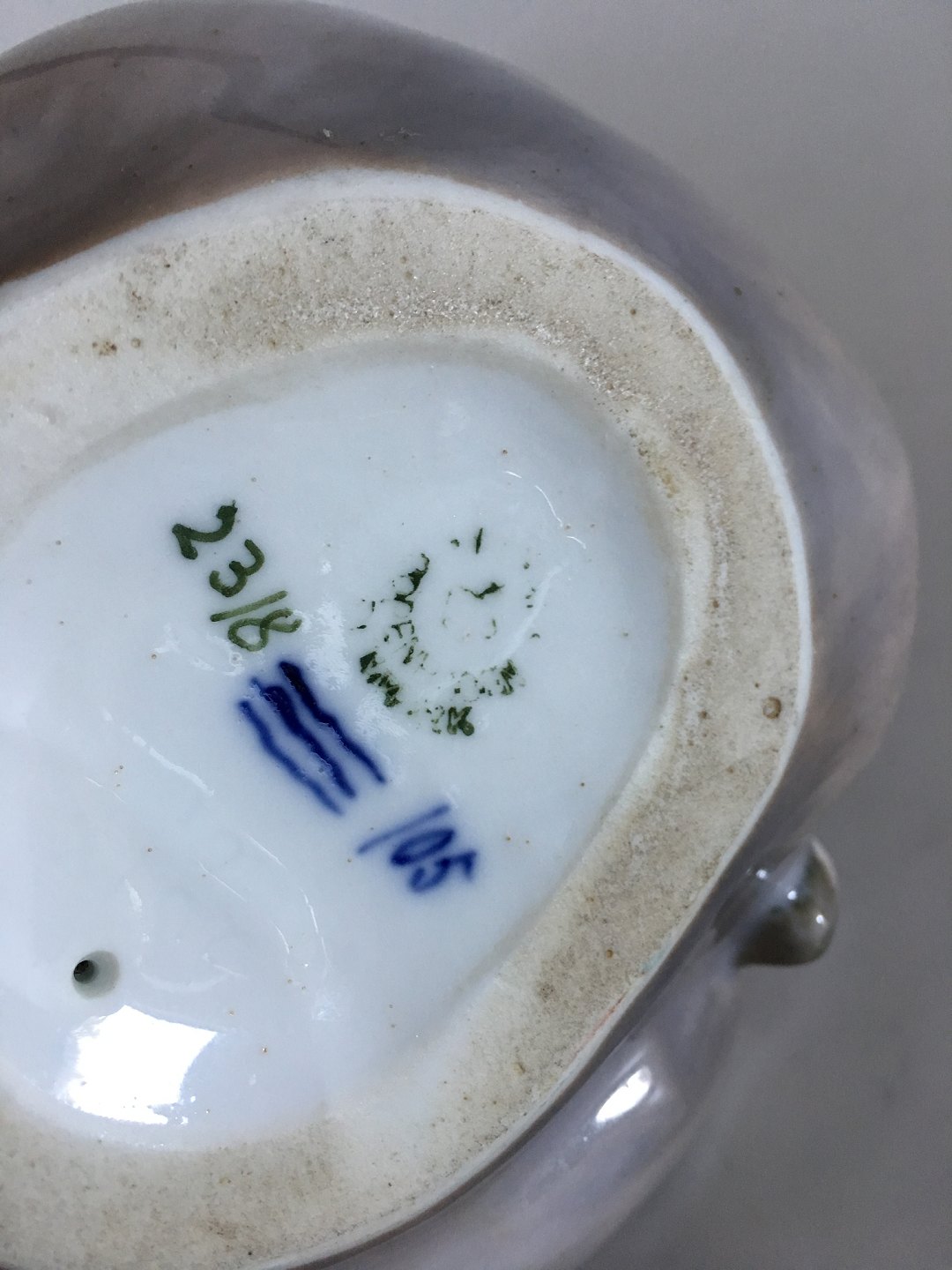 Royal Copenhagen Figurine of Faun with Grapes Sitting on a Bear No 2318. Reparation around the neck of the Faun. 17 cm tall (6 11/16"). 15 cm wide (5 29/32")