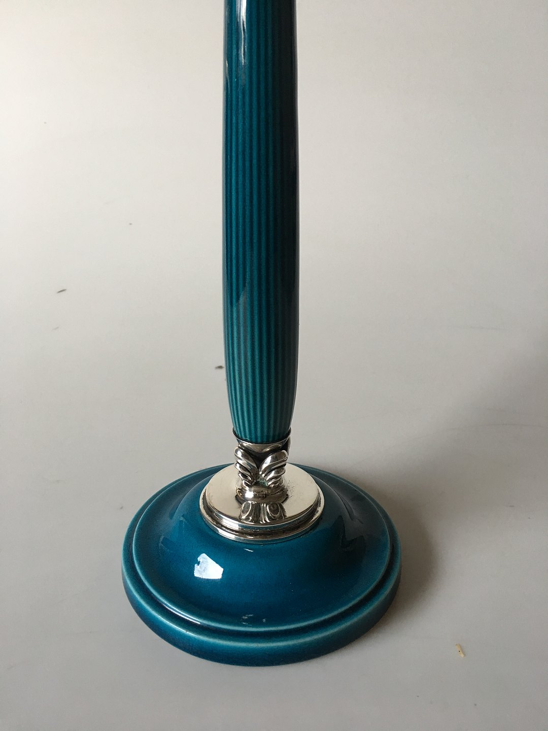 Georg Jensen Candlestick in Sterling Silver and Porcelain No 4001. Design by Harald Nielsen. Porcelain pieces by Bing & Grondahl. Marked Georg Jensen & Wendel. From 1945-1951. 29 cm H. (11 27/64")