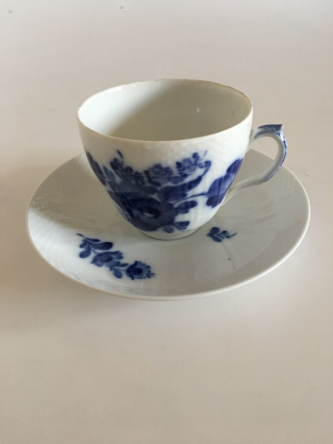 Royal Copenhagen Blue Flower Curved Coffee Cup with Saucer No 072. The cup measures 6 cm H. 7.5 cm dia. The saucer measures 14 cm dia. In nice condition.