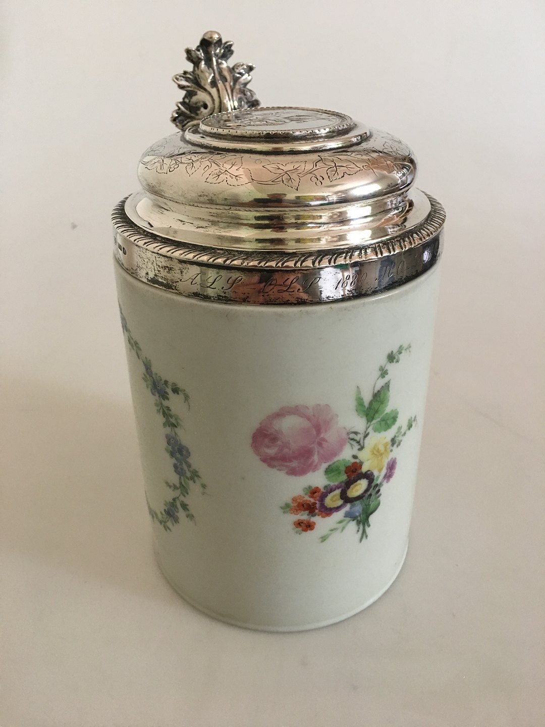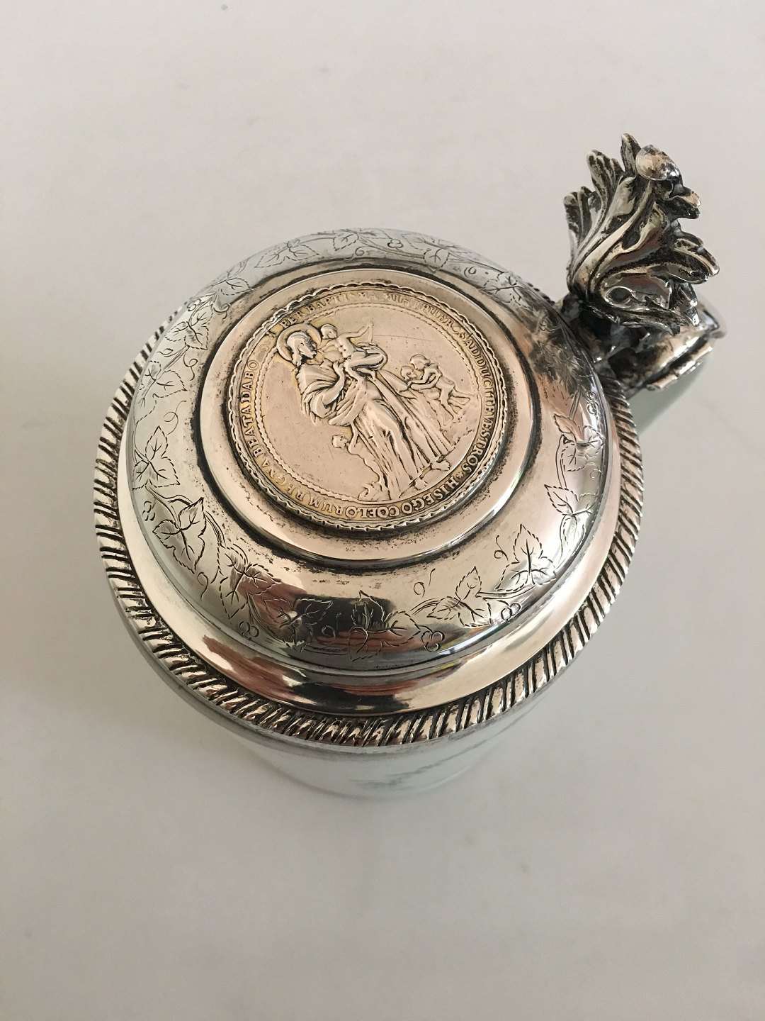 Royal Copenhagen Mug from 1790-1810 with Silver Lid Ornamented with a Religious Motif. Lid is done by Christen Christensen Born 1830, dead 1885. Silversmithy from 2-5-1861. Measures ca. 18.5 cm H (7 9/32"). 12 cm dia (4 23/32")