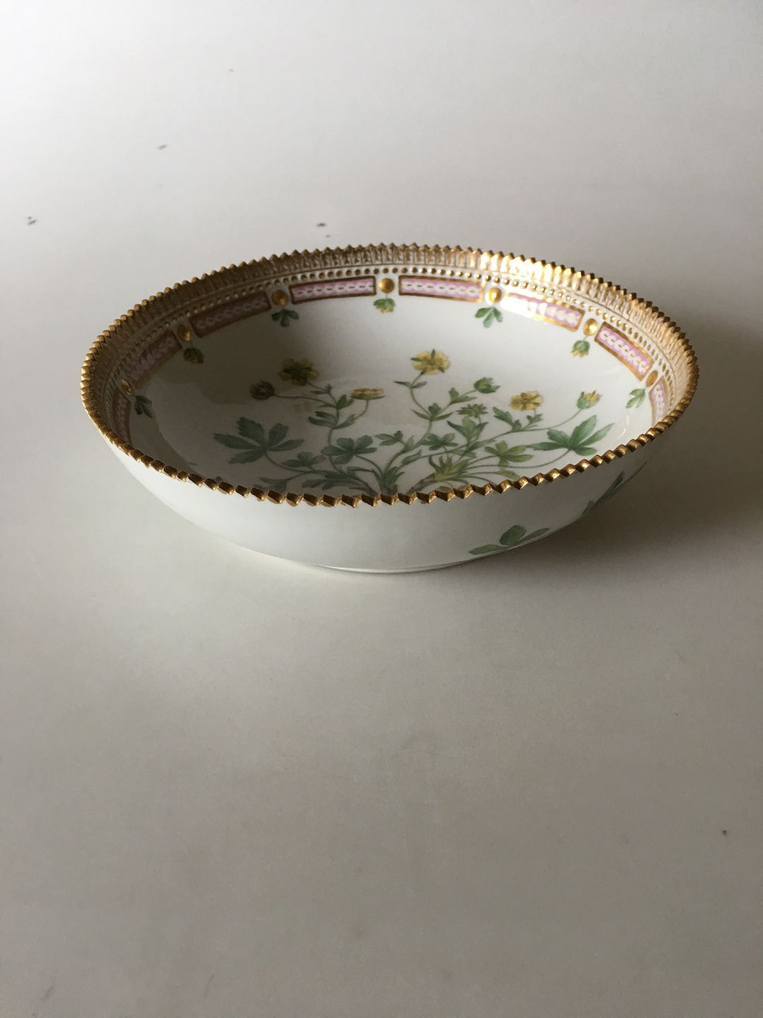 Royal Copenhagen Flora Danica Bowl No. 3503. Latin Name: Potentilla Verna. 5.5 cm H. 20 cm diameter. In perfect condition.