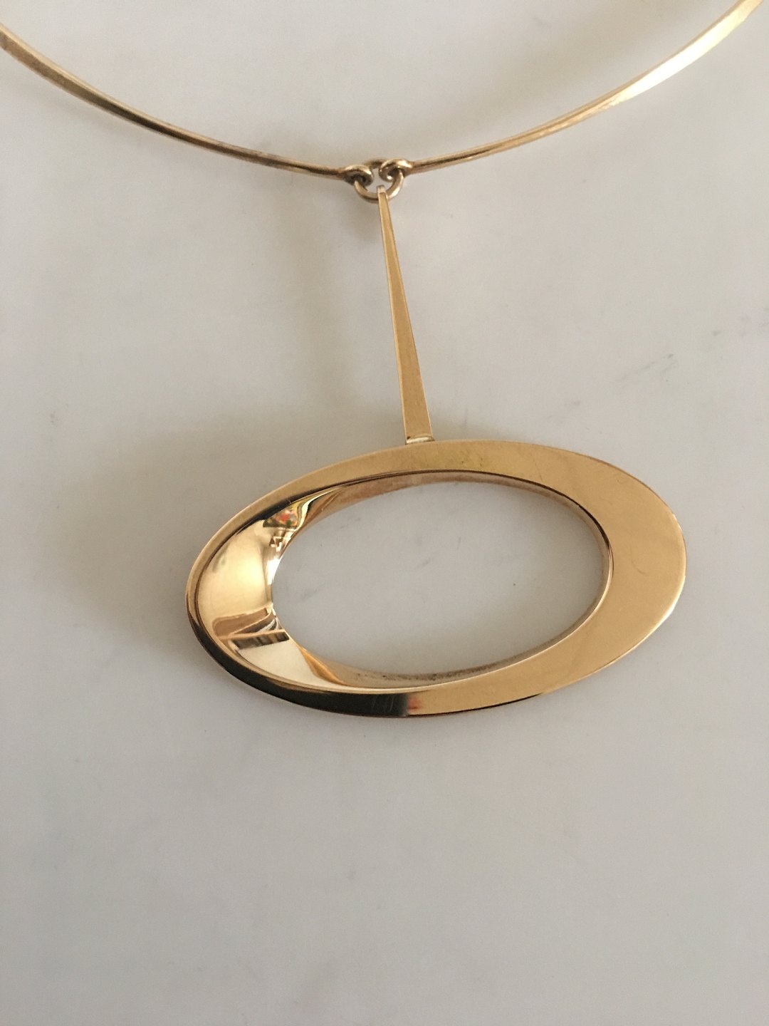 Hans Hansen 14K Gold Pendant No 103 in 14K Gold Chain (Not by Hans Hansen). Diameter of the neckring measures 12 cm / 4 23/32 in. Oval diameter of the pendant measures 5.5 cm / 2 11/64 in. Weighs 25 / 0.90 oz.
