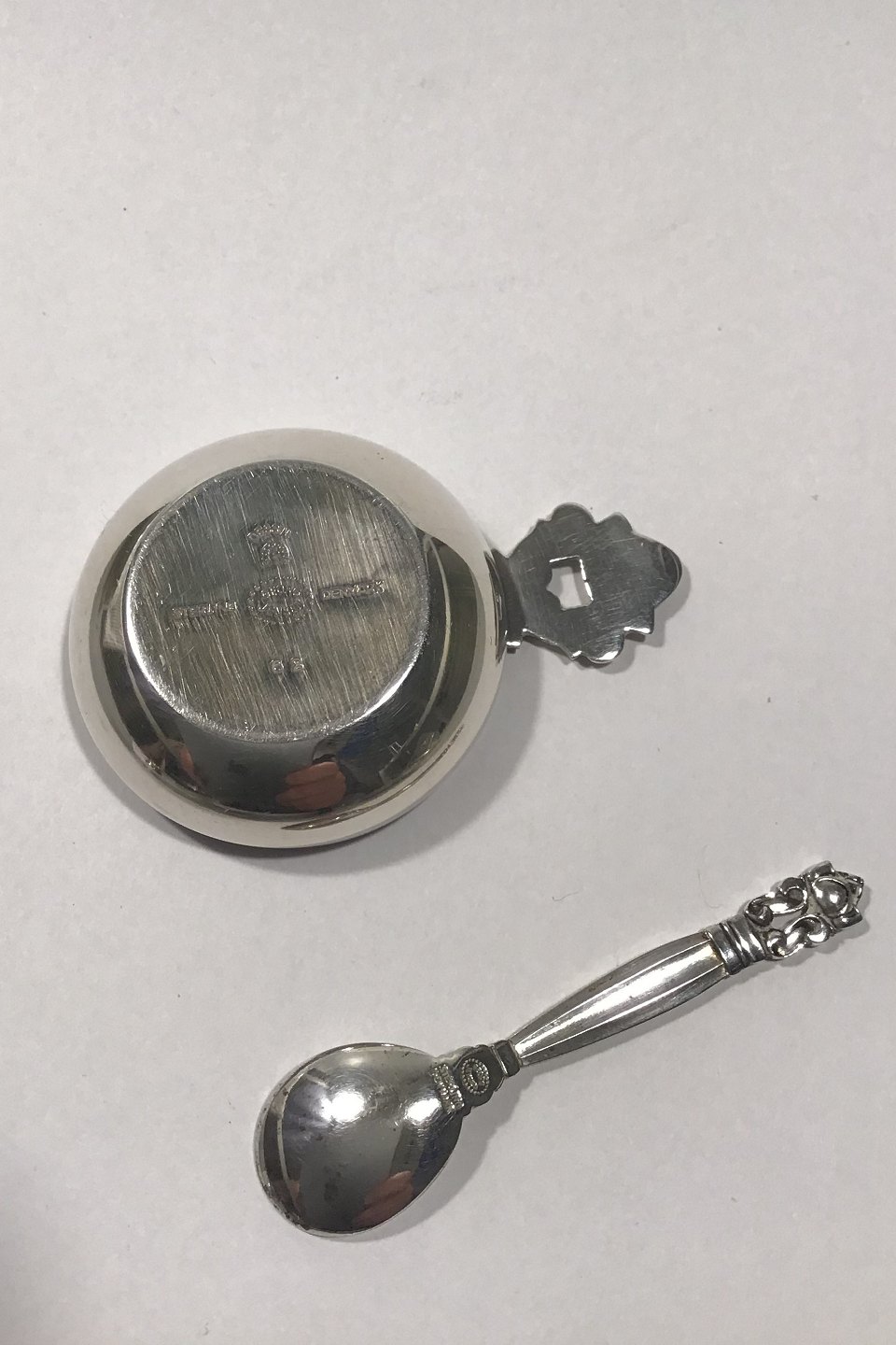 Georg Jensen Sterling Silver Acorn Saltcellar No 62 (Green enamel) and Salt Spoon Measures 4.1 cm(1 39/64 in) Spoon 6 cm(2 23/64 in)