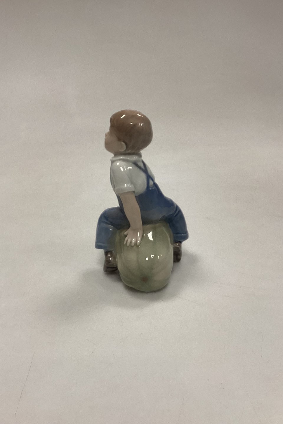 Royal Copenhagen Figurine Boy on Pumpkin No. 4539 or 153. Designed by J.M. Nissen. Measures 12 cm / 4.72 in.