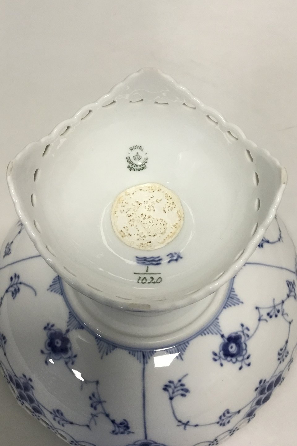 Royal Copenhagen Blue Fluted Full Lace Cake Bowl on Foot No 1020. Measures 14.5 cm x 20.5 cm / 5 45/65 in. x 8 5/64 in. Chips on edge.
