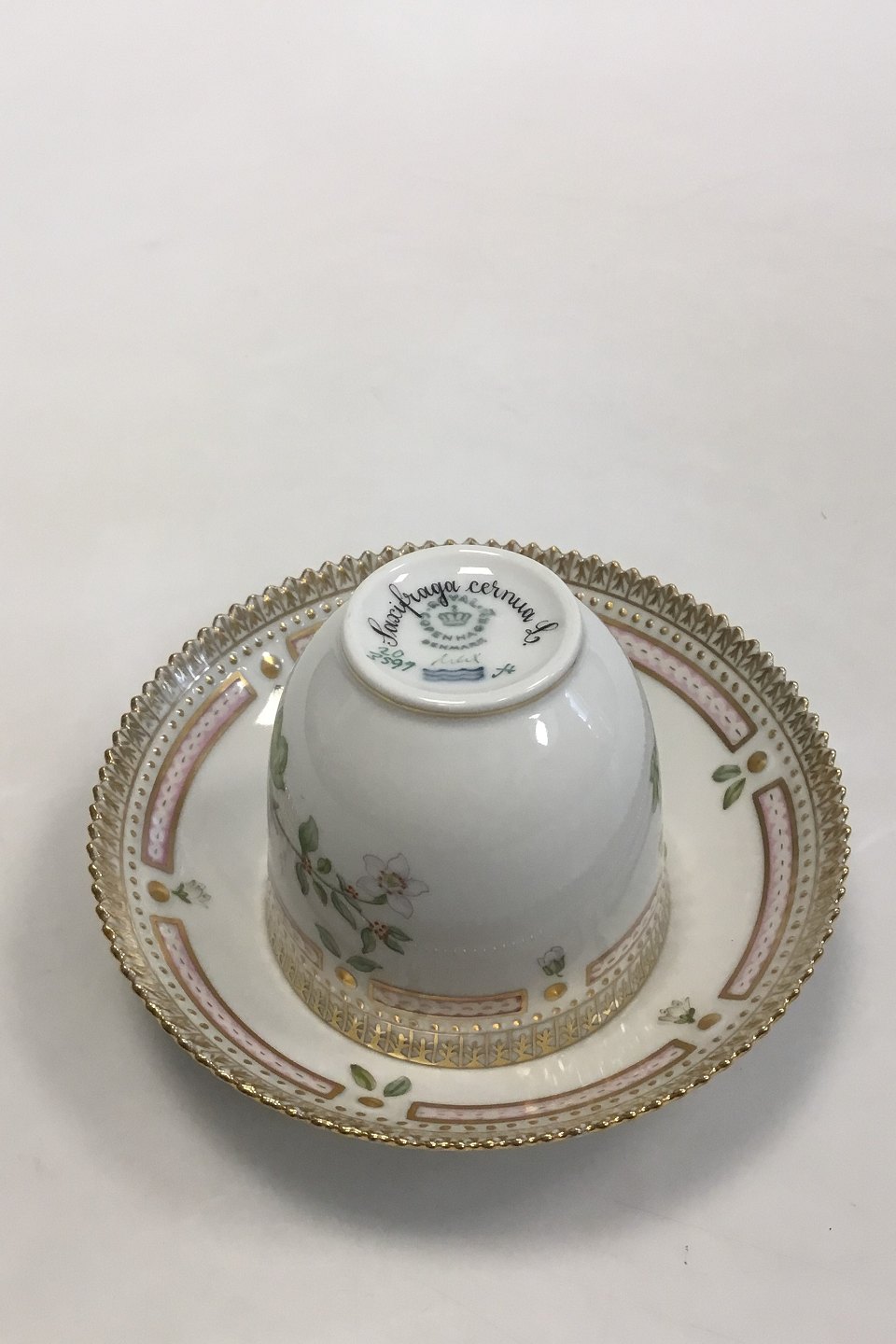 Royal Copenhagen Flora Danica Kaffekop og Underkop No 20/3597. Latinsk Navn: Saxifraga cernua L. Måler Kop: 7 cm x 7,5 cm dia. Underkop: 13,8 cm