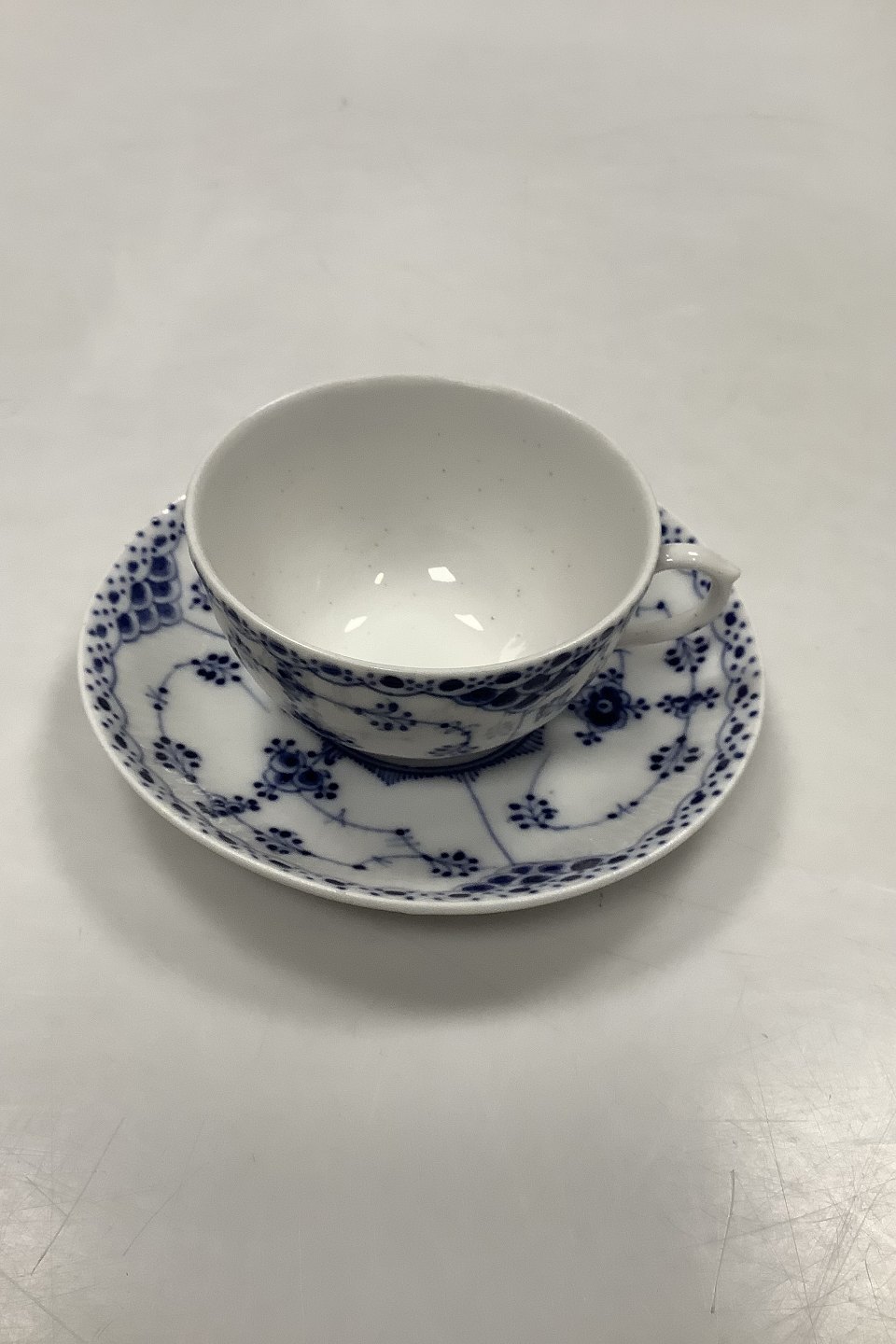 Royal Copenhagen Blue Fluted Half Lace Cup and Saucer No 713. Cup measures 8.5 cm dia / 3 11/32 in. and 5 cm H / 1 31/32 in. 2nd or 3rd Quality, some with black specks.