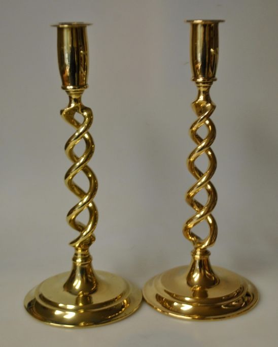 A pair of English "corkscrew" candlesticks in brass, 19th century.