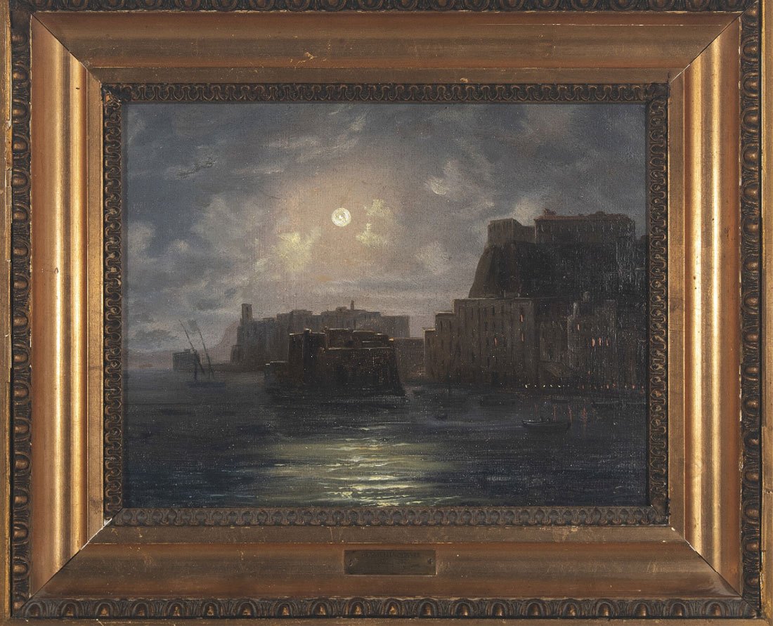 "Sydlandsk havneparti i måneskin" Olie maleri på plade.