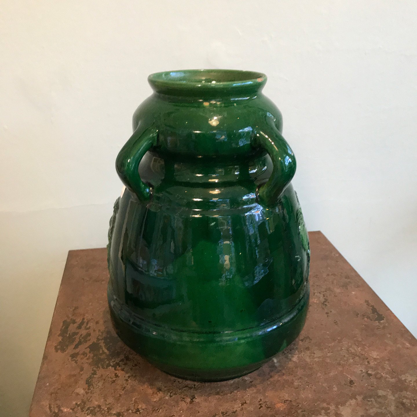 Itemnumber: 492394Large earthenware vase from St. Erik's in Upsala with green glaze, 4 handles and a relief motif of 3 owls on one side and a rooster on the other. Signed and marked St. Erik, Upsala no. 19. The vase is intact and without cracks. but has 2 minor glaze chips on the edge and some scratches on the side. Age about year 1900.