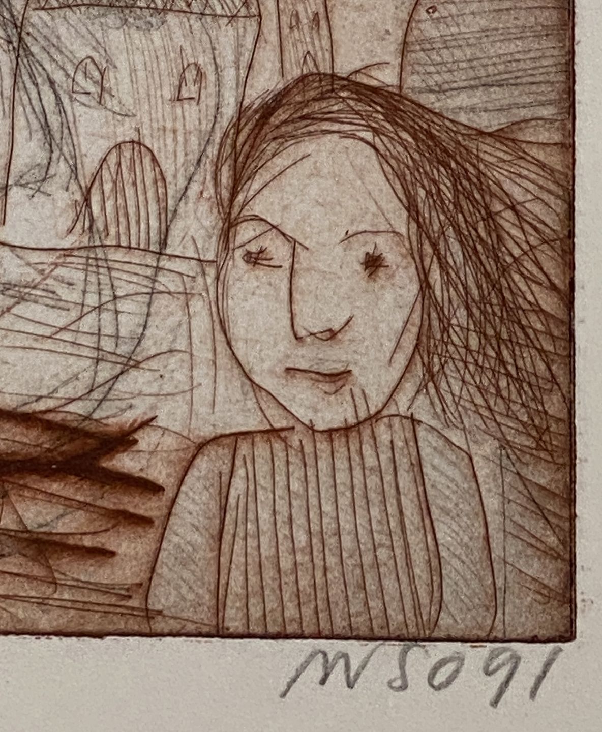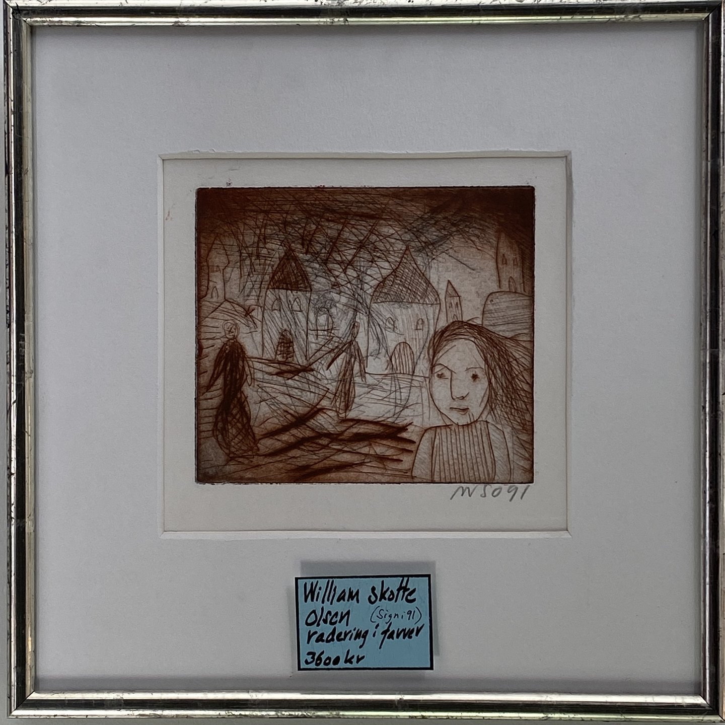 William Skotte Olsen. Erasure in colors. Signed WSO91. silverframe whit passerpartout.