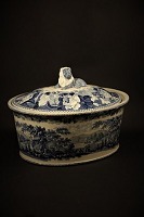 Antique oval, Swedish 1800 century Rørstrand pate terrine in faience with blue glaze with landscape motifs and lying lion on top. . .