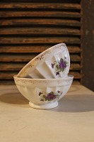Old faience café latte bowl with a rose flower motif on the side. . .