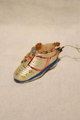 Old hand-painted Christmas ball in very thinly mouth-blown glass from around the year 1920. Painted with small skier. H:12cm. Item number: Jul nr.202