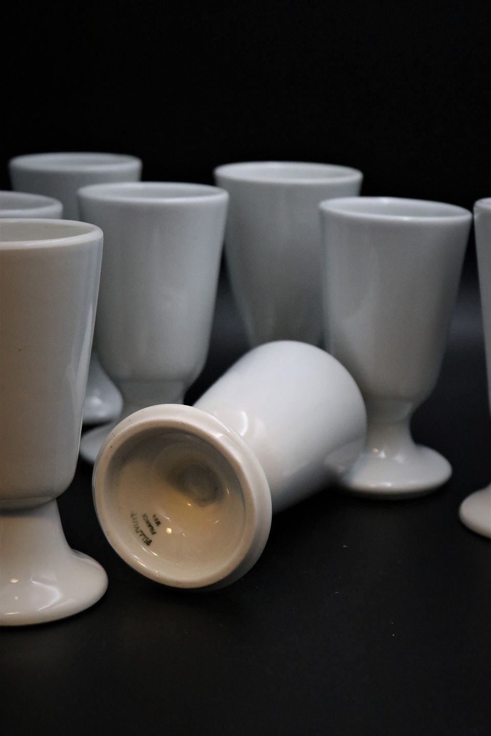 Gamle franske kaffe krus på fod i kraftig hvid porcelæn.