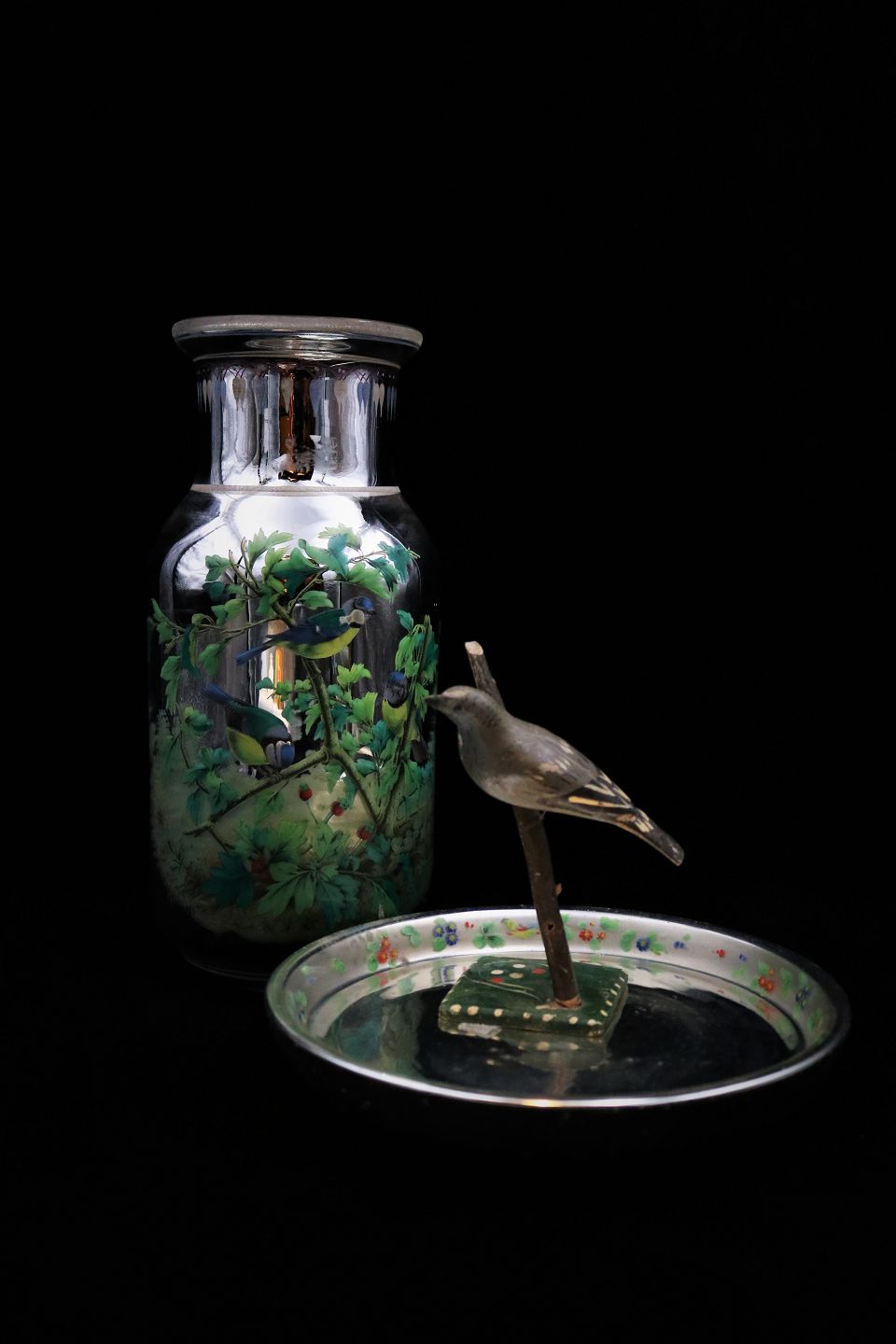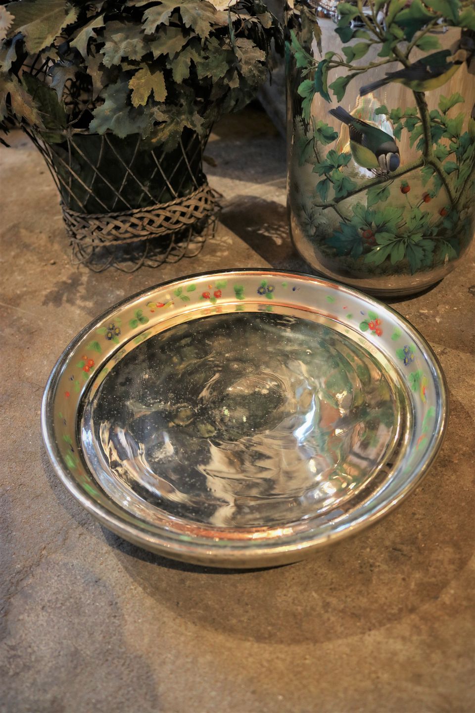 Rare, antique dish in poor man's silver ( Mercury Glass ) from the 1800 century with a fine patina decorated with hand-painted flowers...