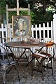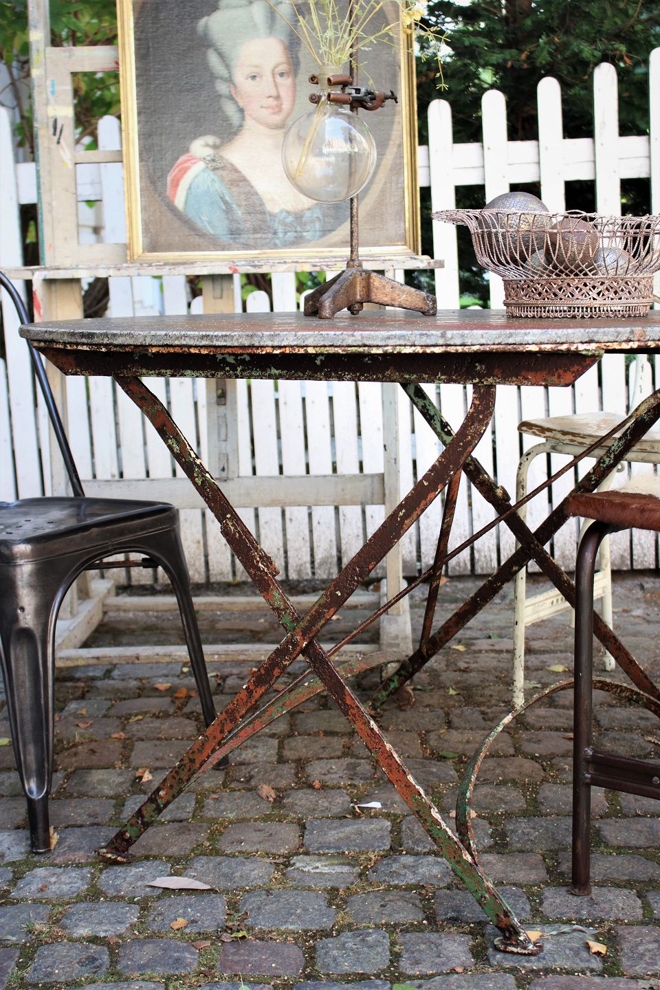 Old garden table from the South of France with raw stone top and wrought iron base with a super fine patina (can be folded together) H:72cm. Dia.:110cm. Usable both inside and outside.